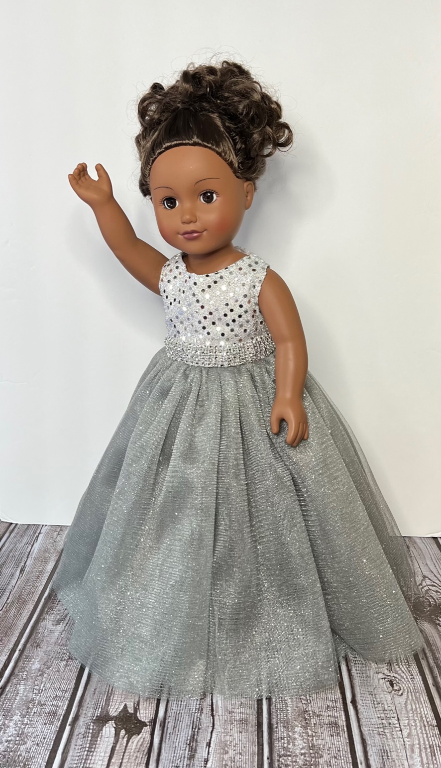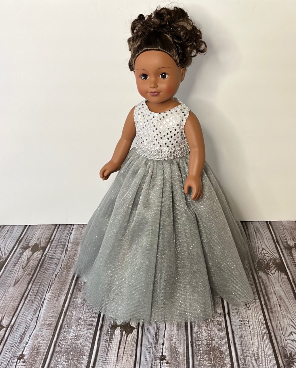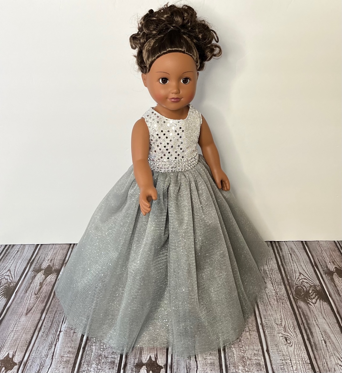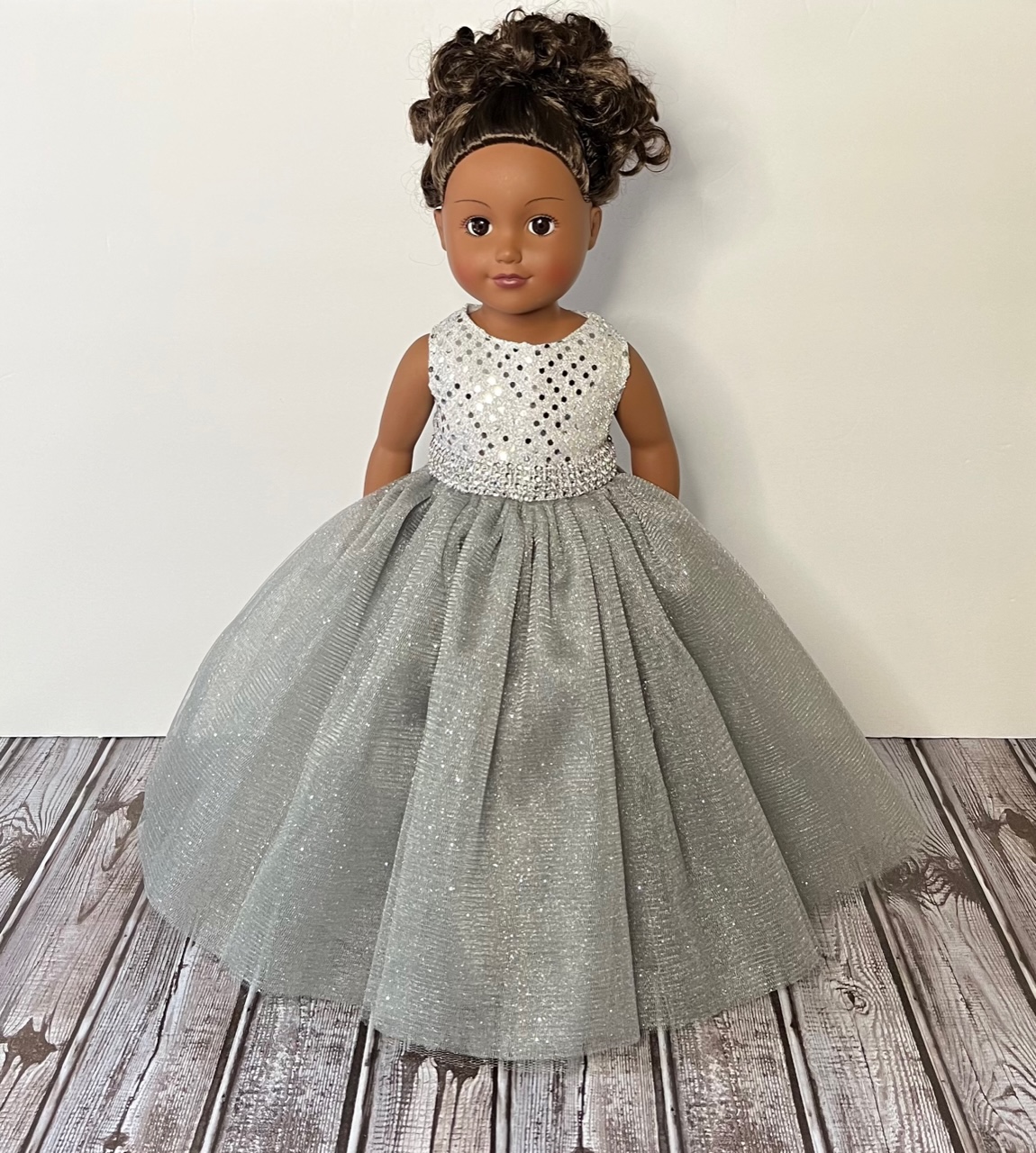 Measuring 13 inches from shoulder to hem and 10¾ to 11 inches around the waist, this gown is designed to fit 18-inch dolls such as American Girl, Gotz, Our Generation, Journey, and Springfield Collection dolls. Watch their faces light up as they step into this silver daydream.