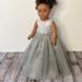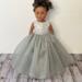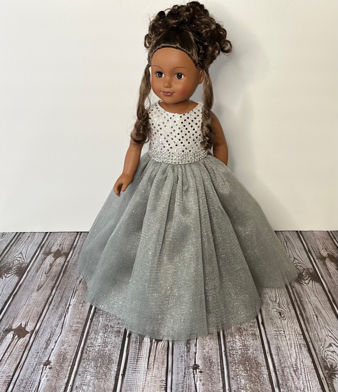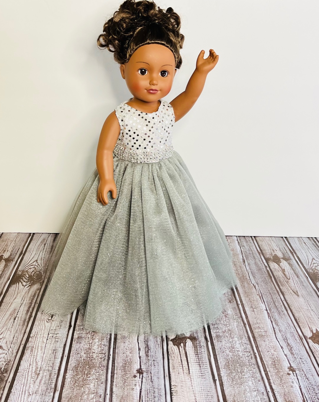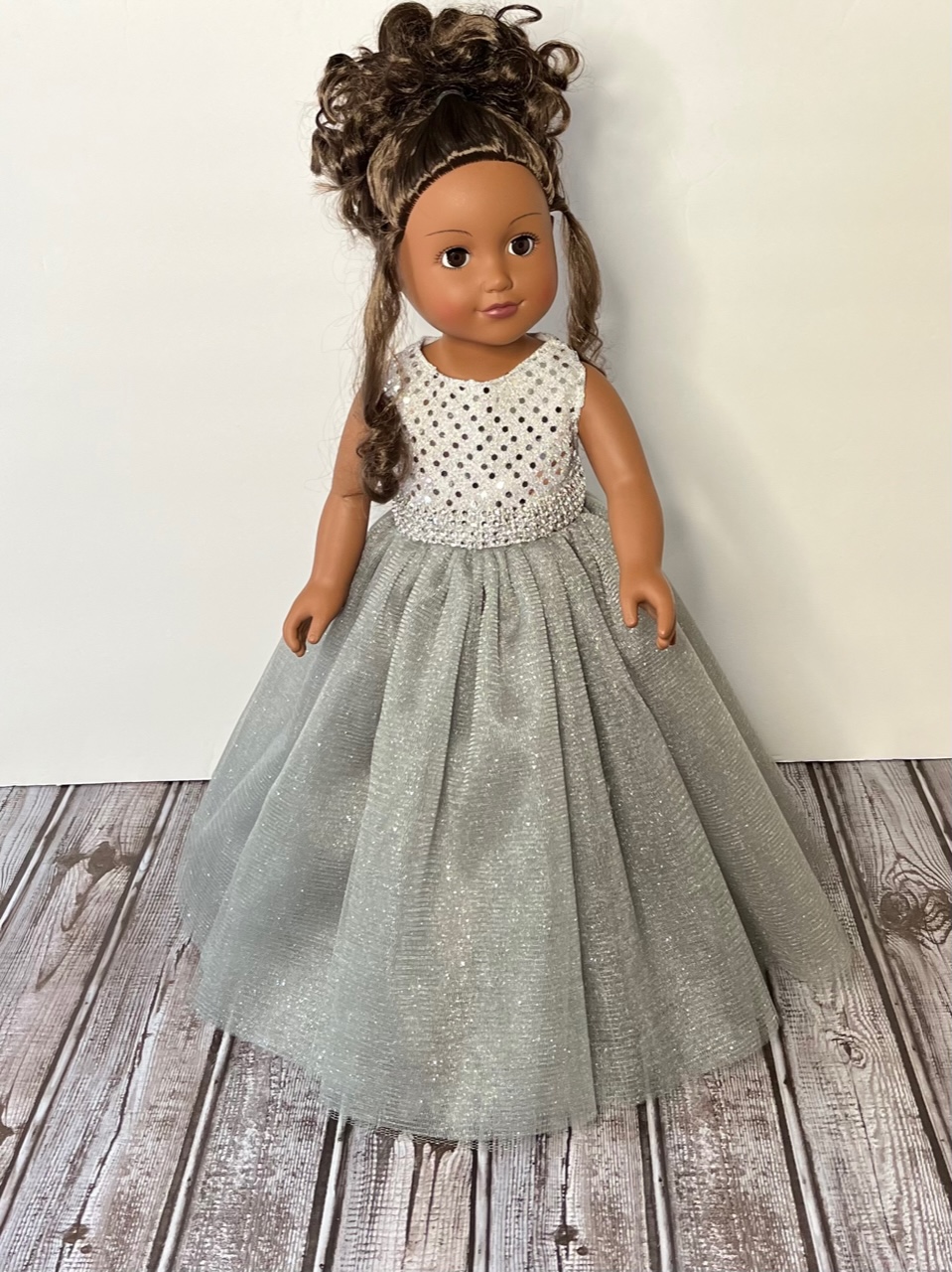 Measuring 13 inches from shoulder to hem and 10¾ to 11 inches around the waist, this gown is designed to fit 18-inch dolls such as American Girl, Gotz, Our Generation, Journey, and Springfield Collection dolls. Watch their faces light up as they step into this silver daydream.
