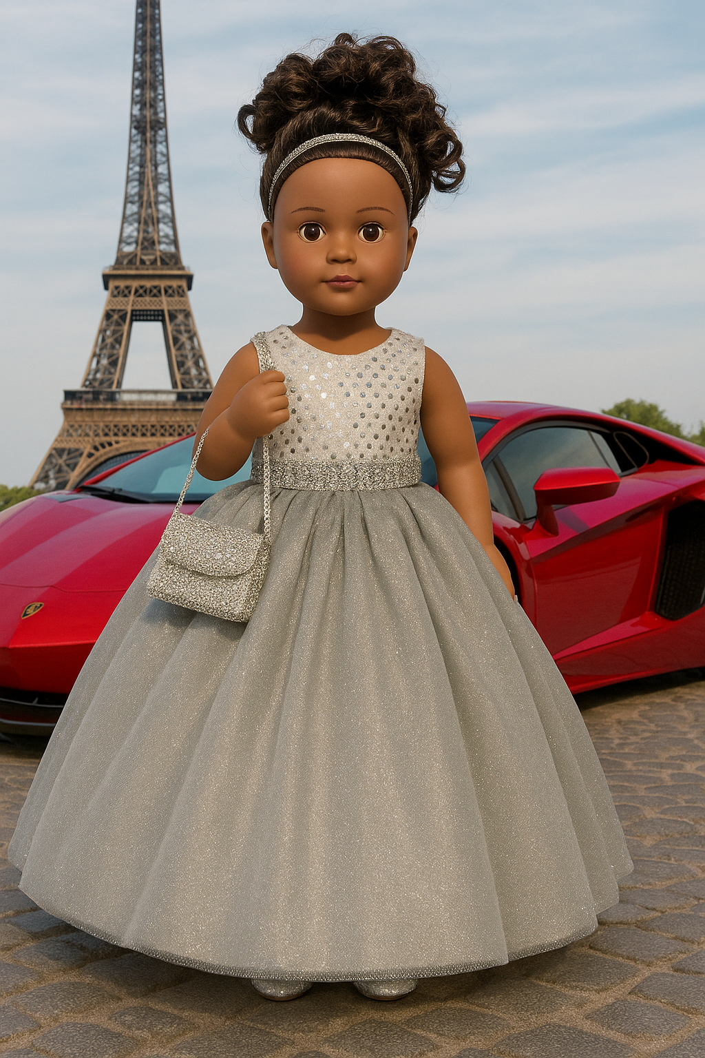 Silver Enchantment: Quinceañera Doll Ball Gown
