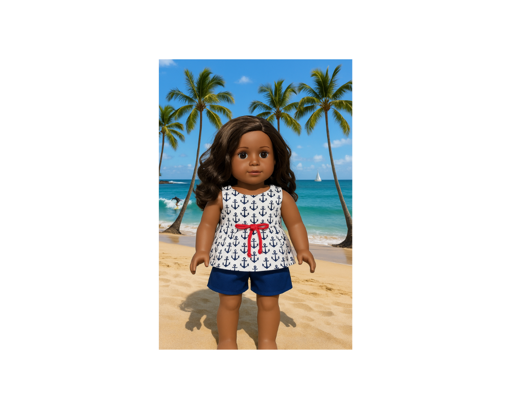 Charming Summer Doll Outfit Delight in this 100% handcrafted summer doll outfit, meticulously made with premium cotton fabric. The top, adorned with white and navy anchors, pairs perfectly with the matching navy shorts. The hook-and-loop tape closure at the back ensures easy dressing and undressing. This charming outfit makes an ideal gift for birthdays, Christmas, Hanukkah, Valentine’s Day, Easter, or any occasion. It's a perfect present for both children and doll collectors.