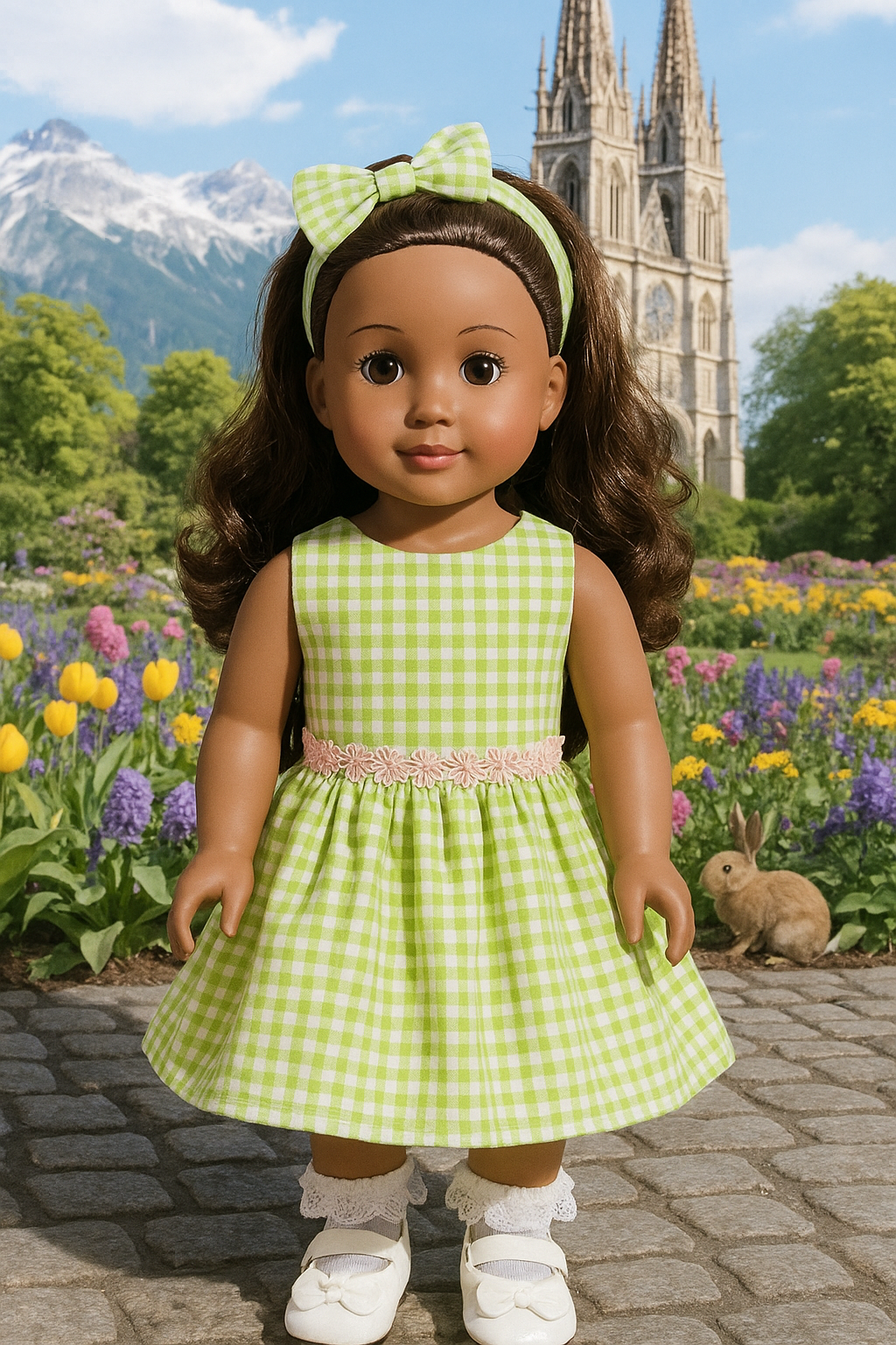 Fresh as a spring breeze and cute as a daisy, this green and white gingham doll dress is full of charm! With delicate pink daisy floral ribbon, this outfit is a cheerful nod to garden parties, Easter egg hunts, and sunny afternoons spent in imaginative play.