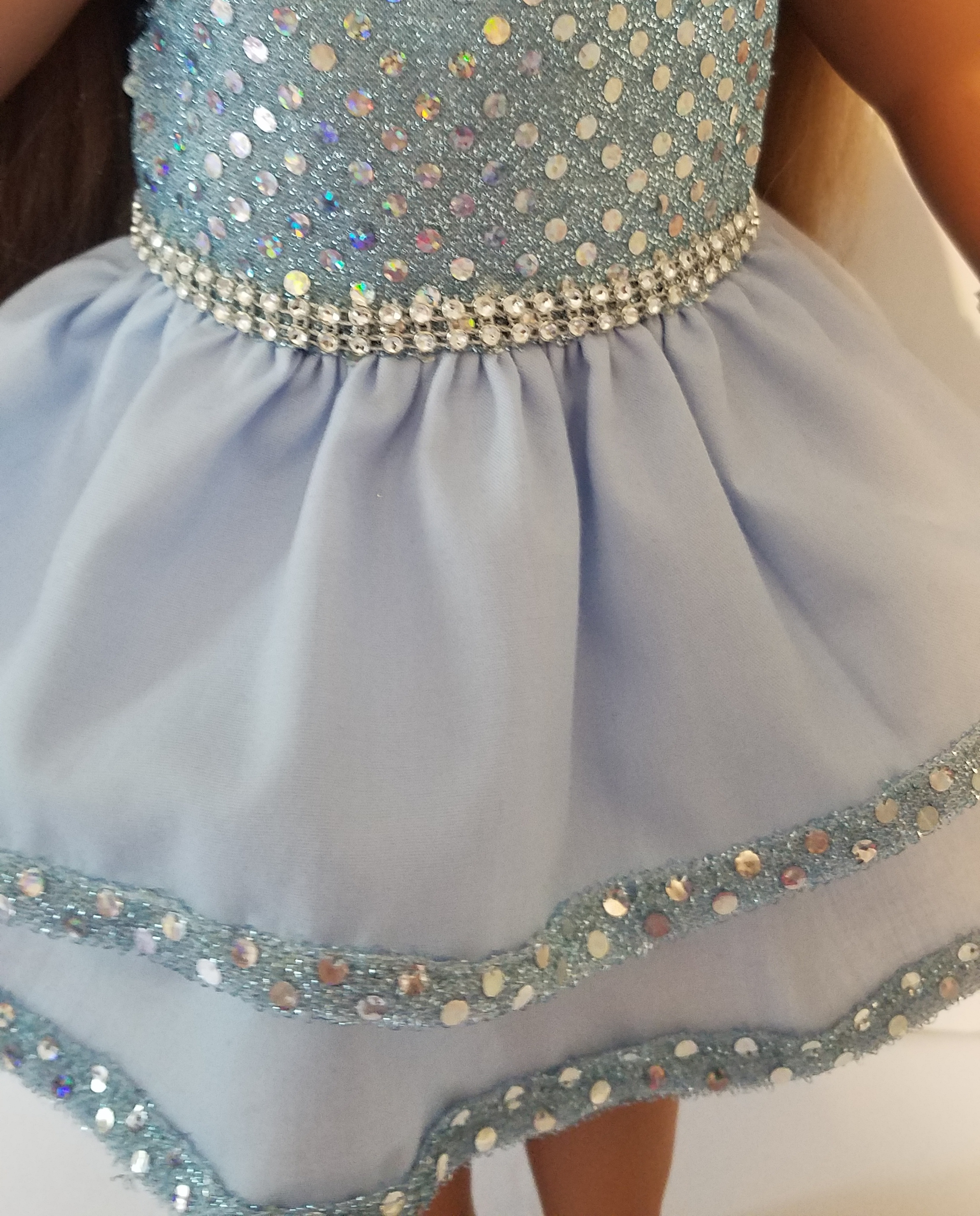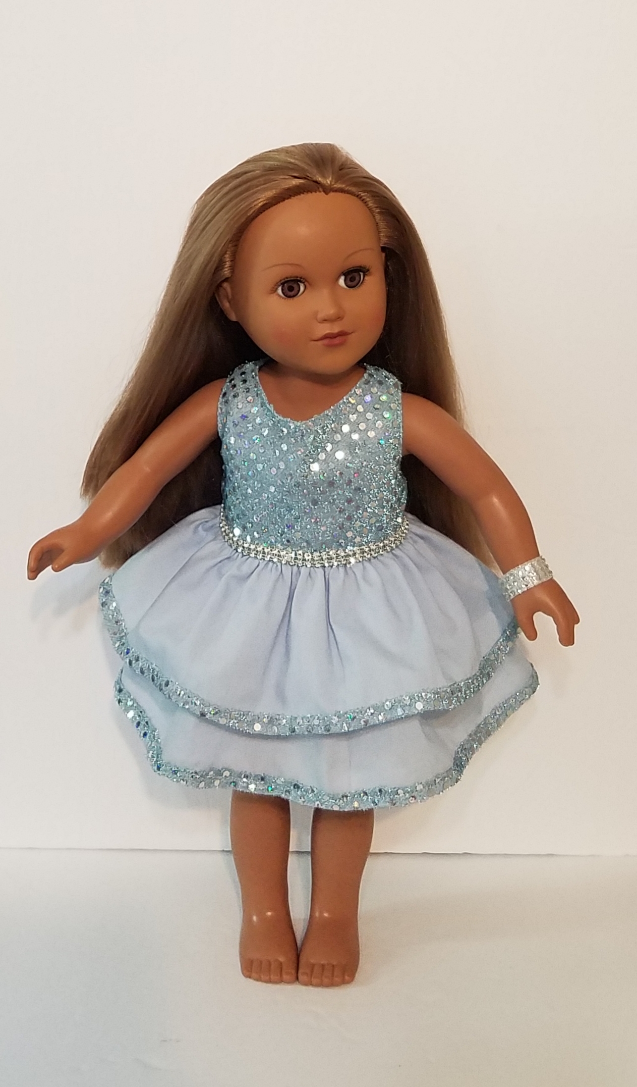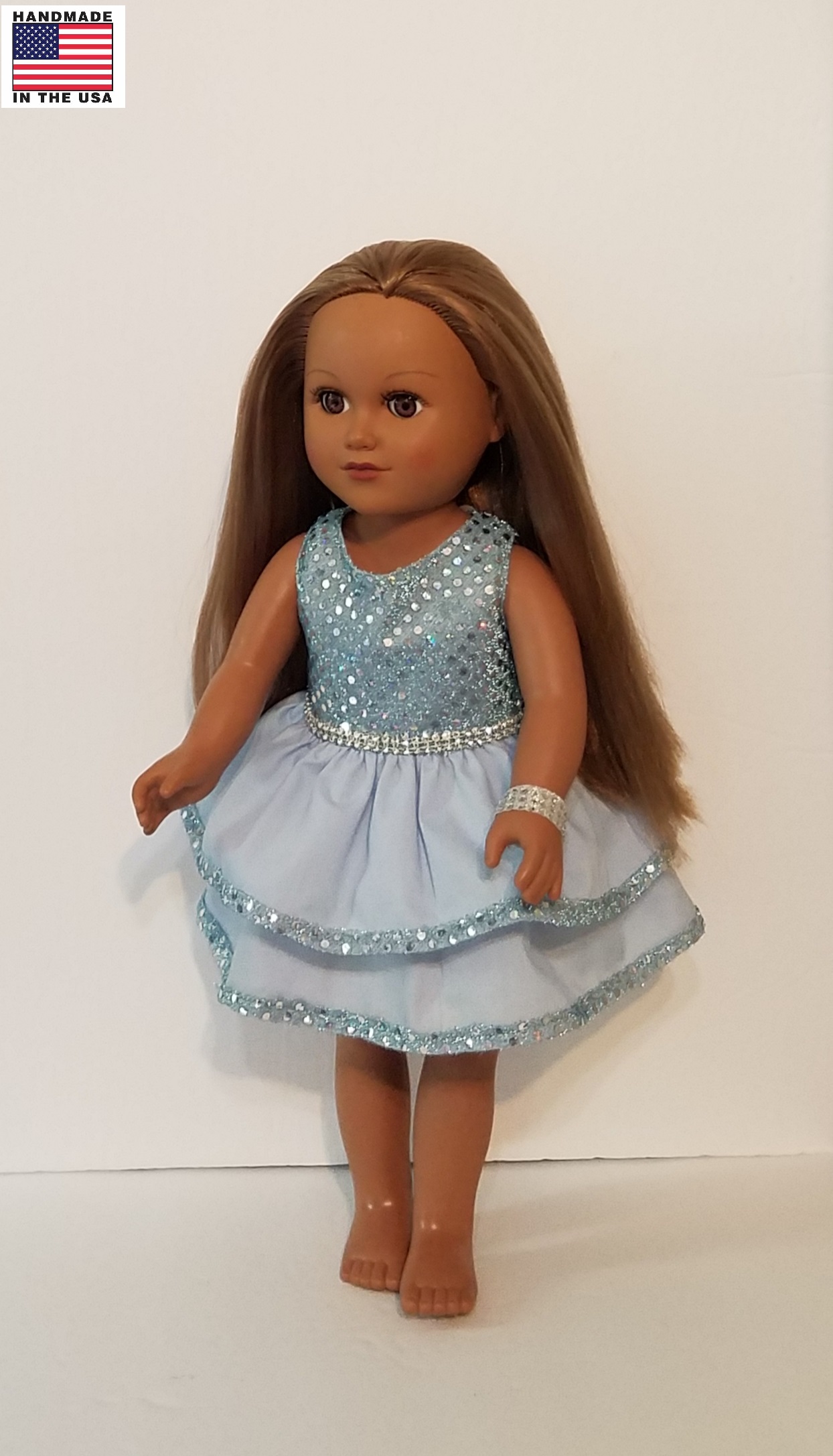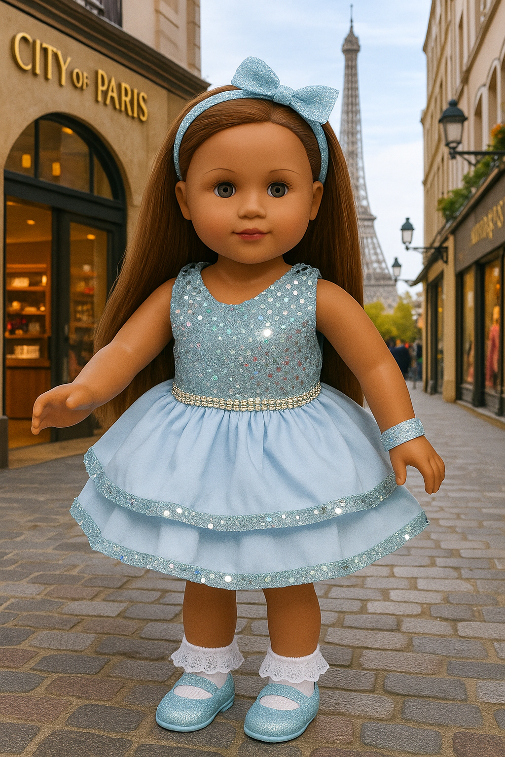 Get ready to shine! This dazzling light blue party dress turns any doll into the star of the celebration. Handcrafted with care, it features sparkling blue sequins that catch the light beautifully, while a silver rhinestone accent adds just the right touch of elegance.