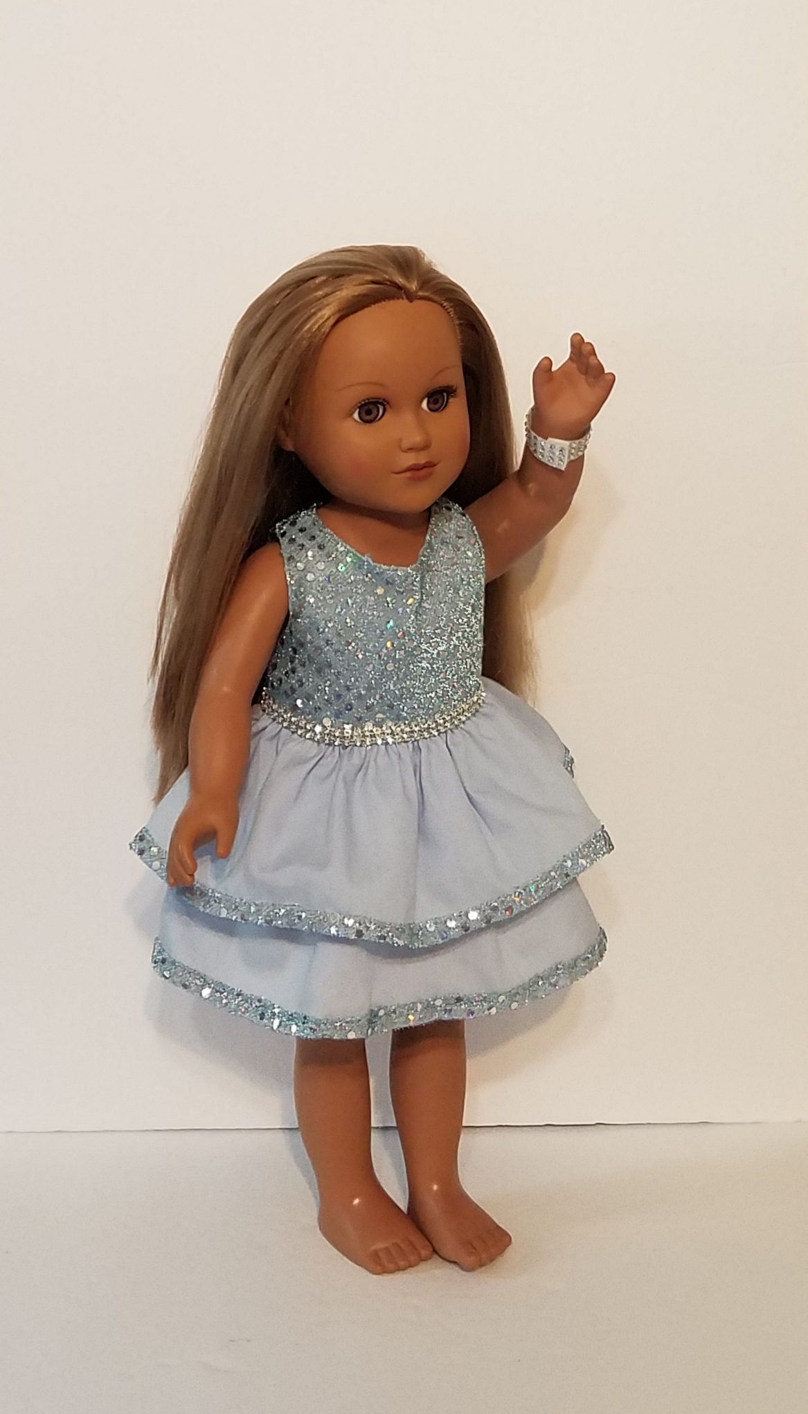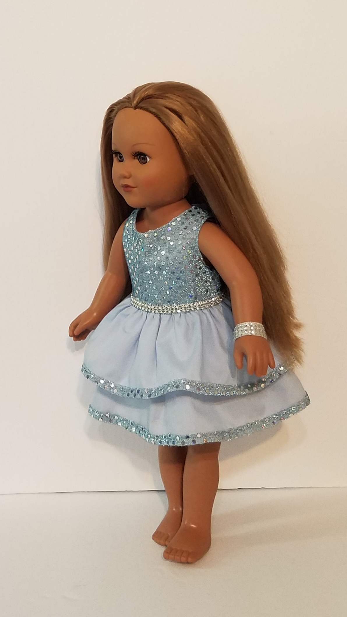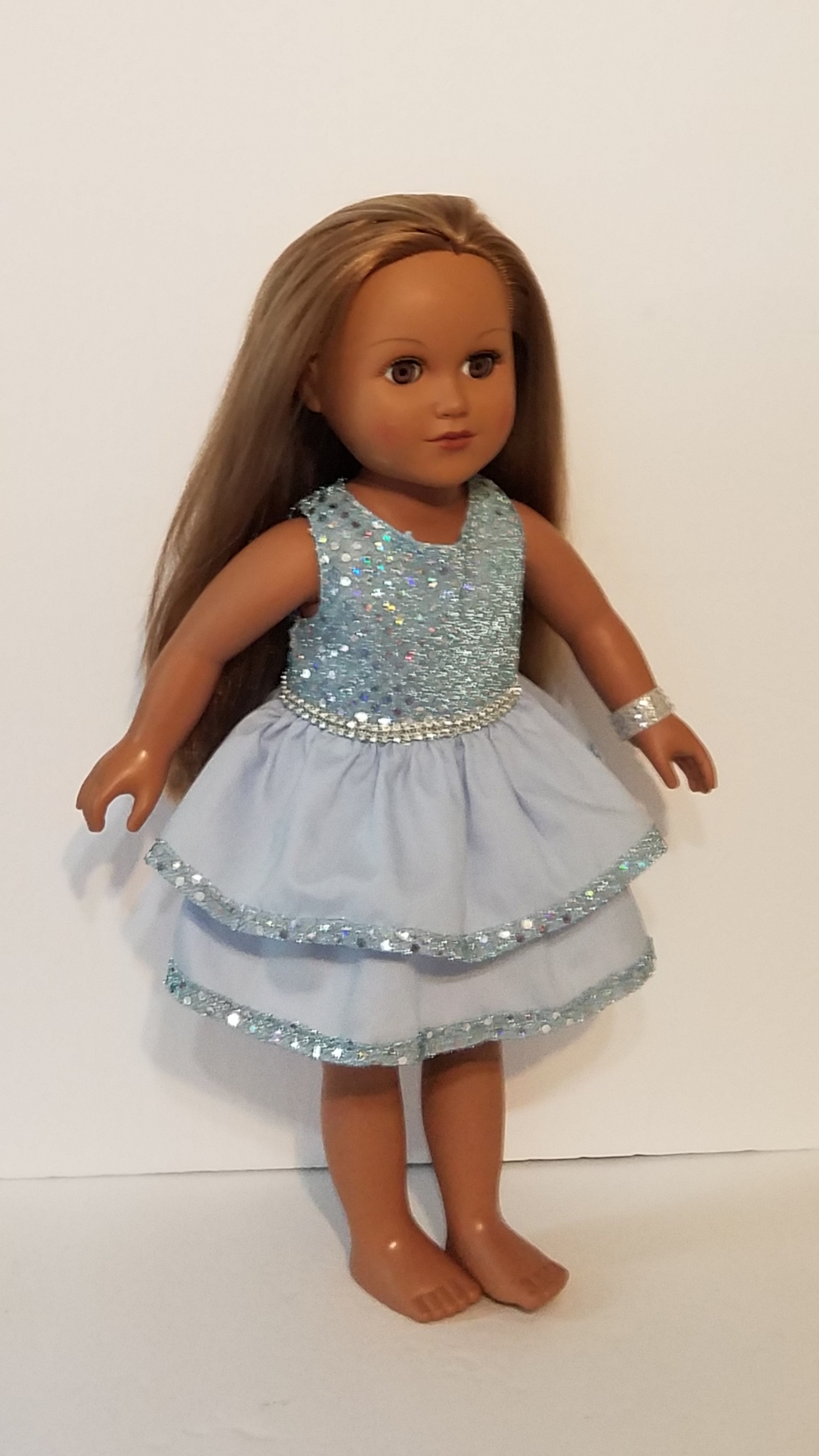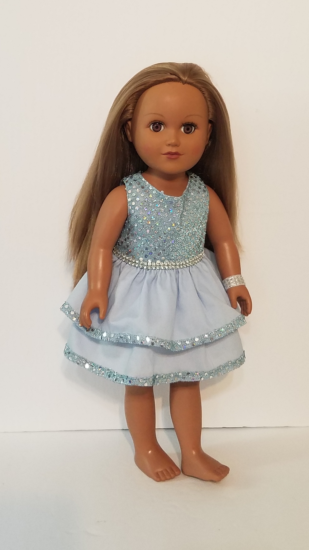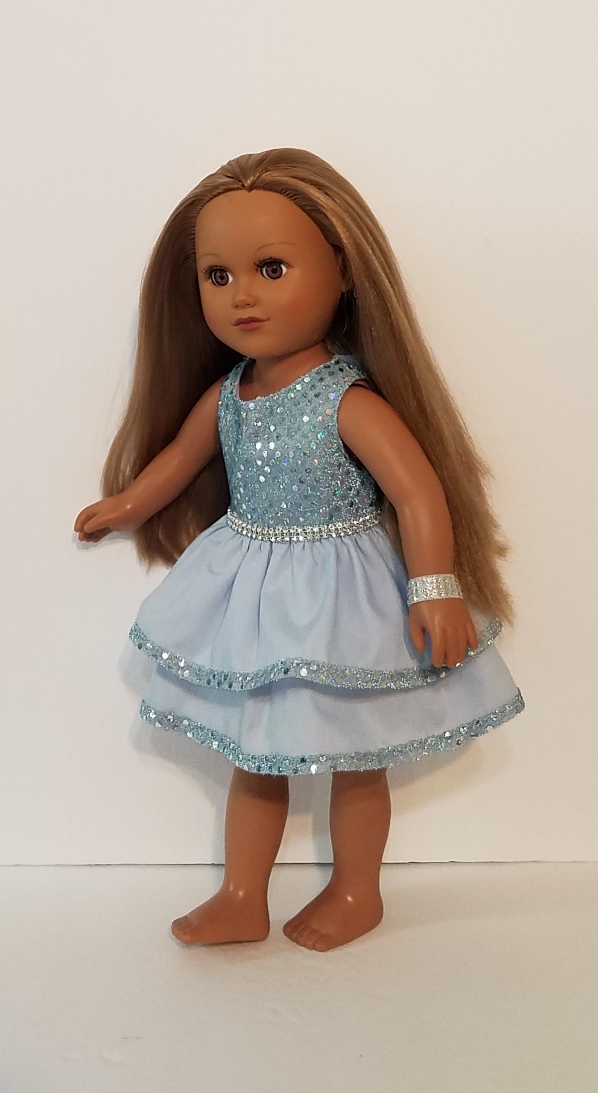 Get ready to shine! This dazzling light blue party dress turns any doll into the star of the celebration. Handcrafted with care, it features sparkling blue sequins that catch the light beautifully, while a silver rhinestone accent adds just the right touch of elegance.