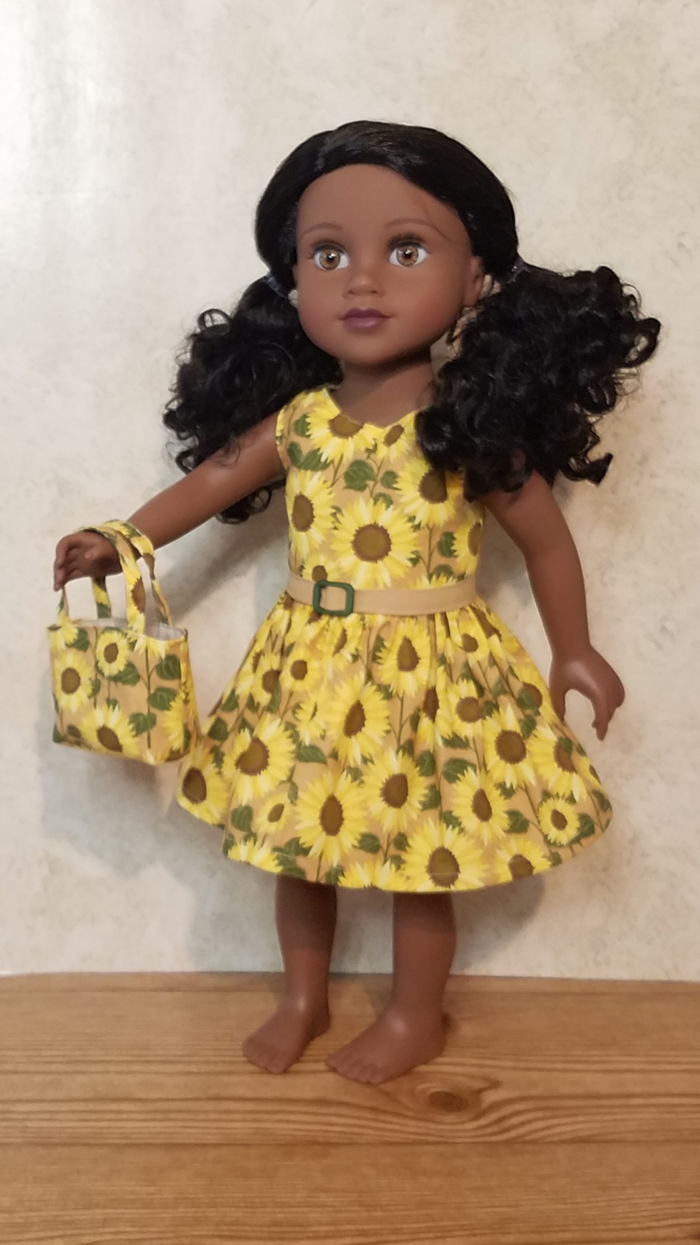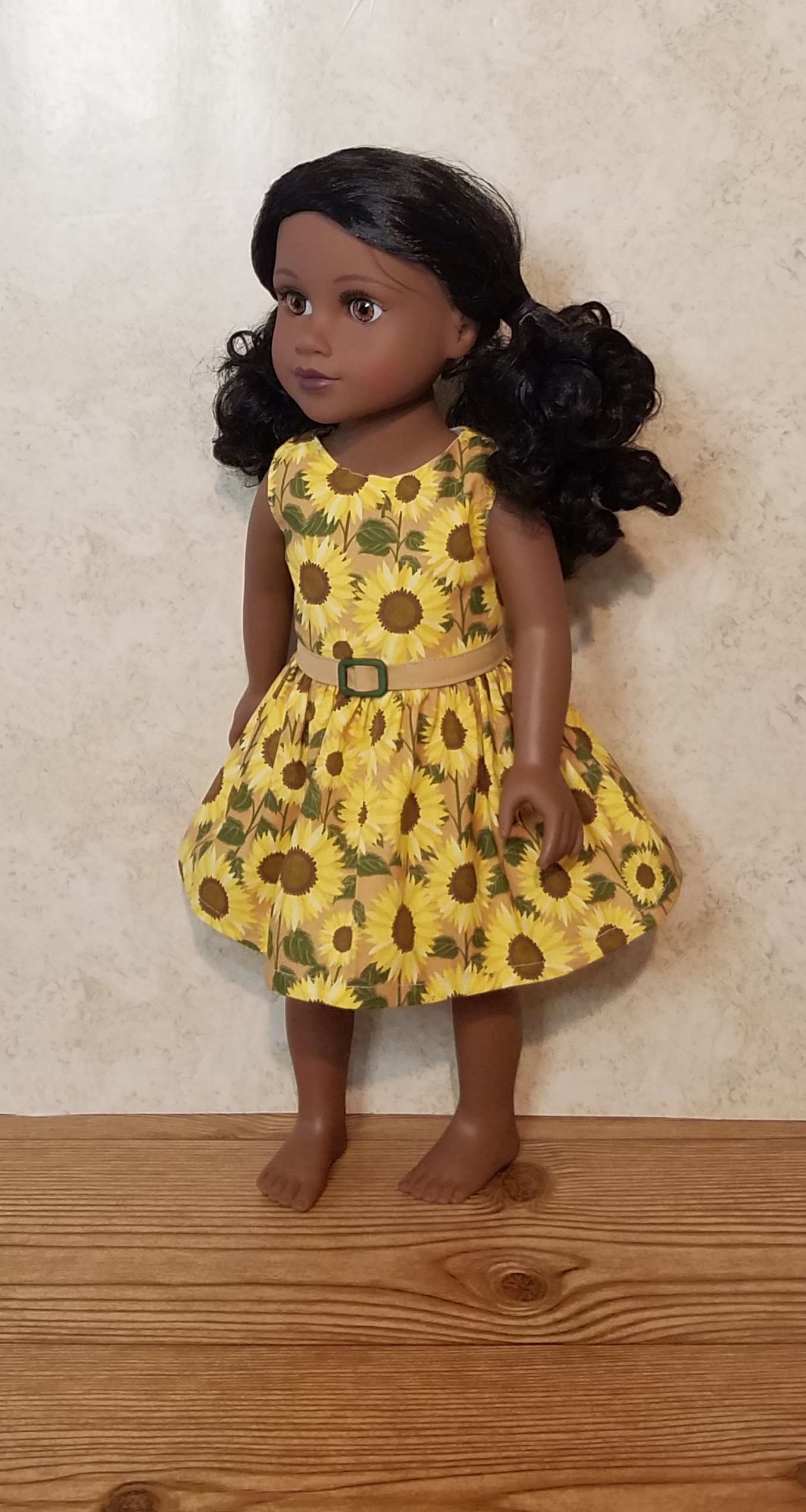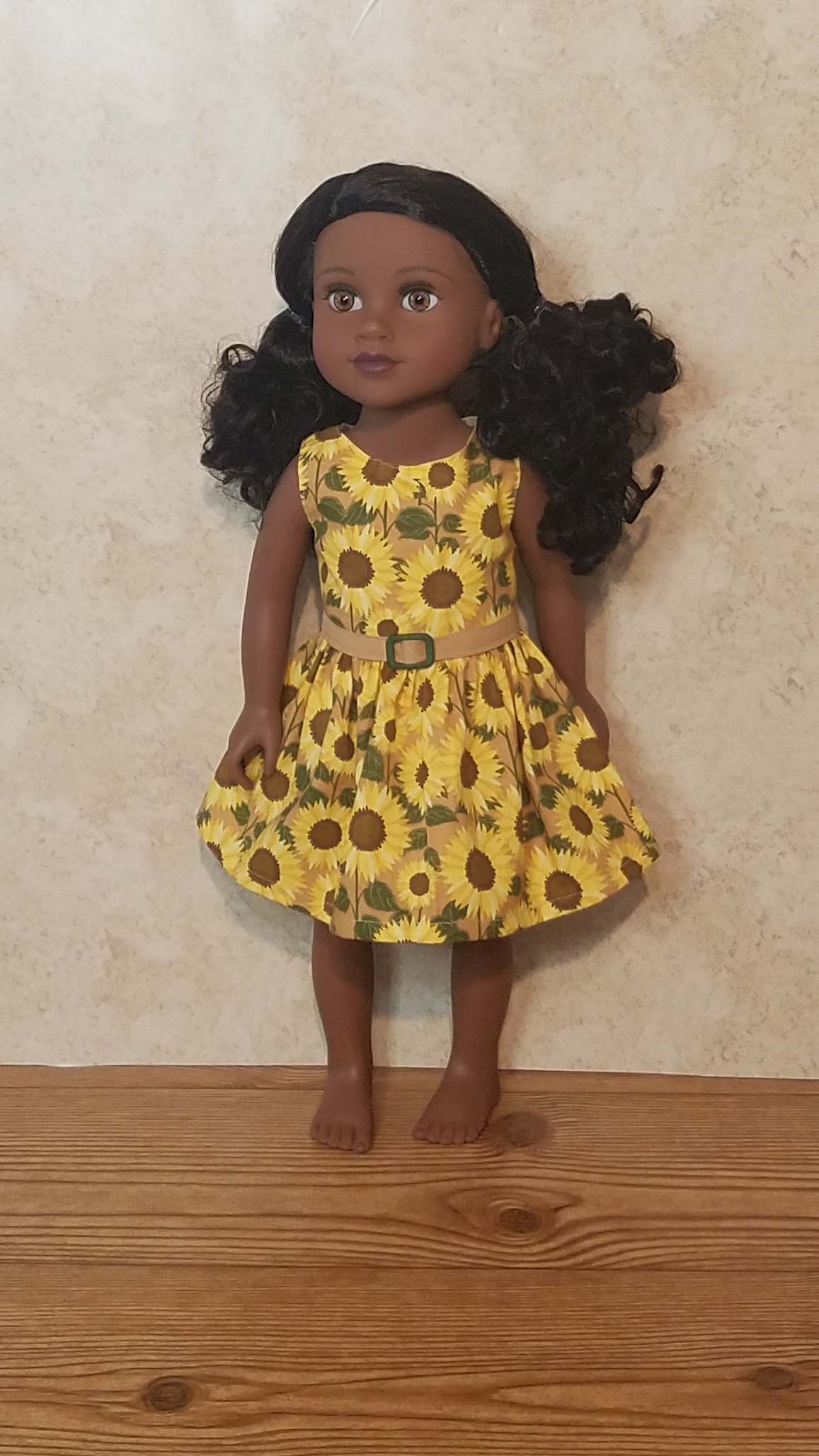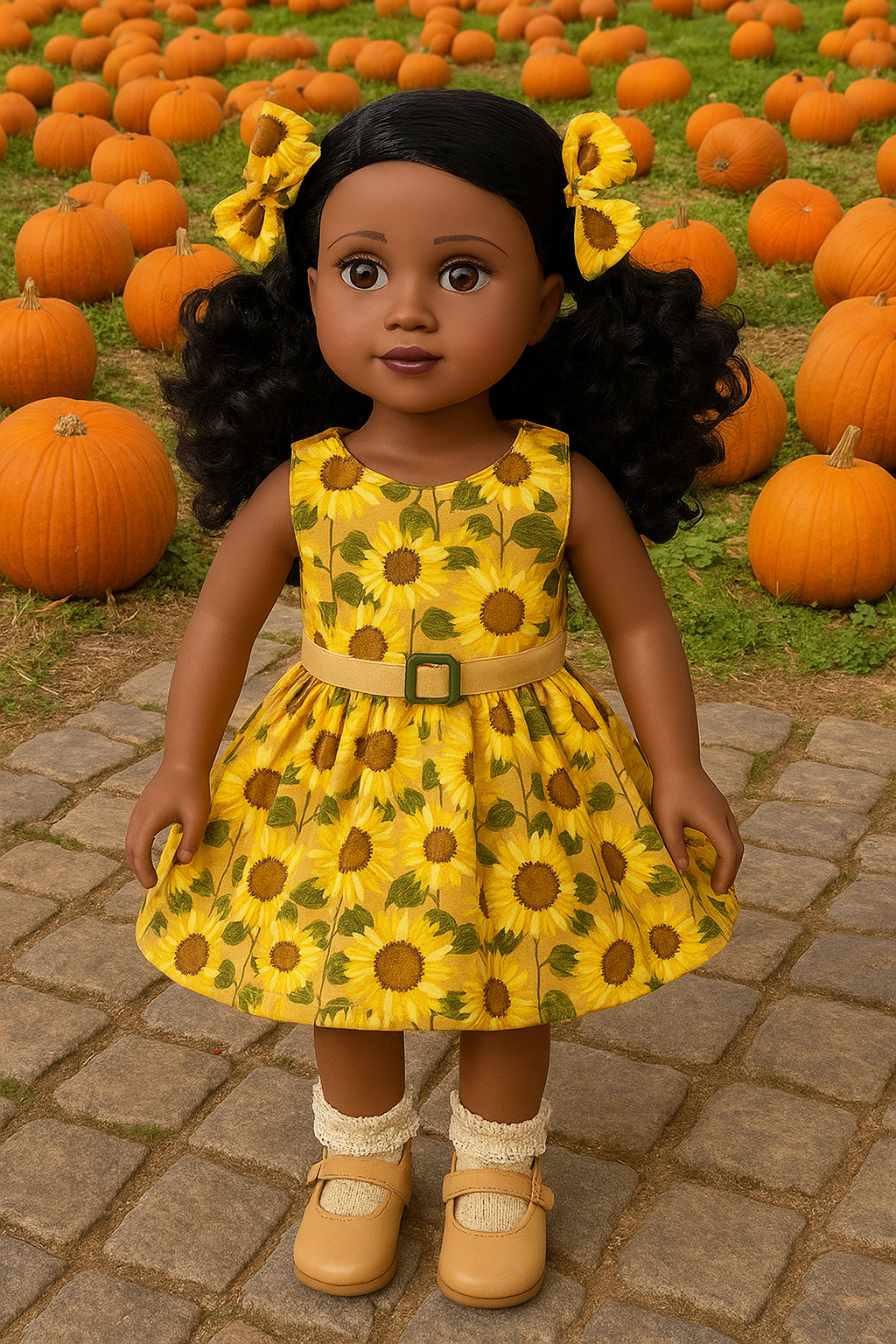 Bring a little autumn sunshine to your doll’s wardrobe with this handcrafted sunflower and beige dress, perfect for Thanksgiving gatherings and fall playtime. Made with premium cotton fabric, it features a simple hook-and-loop closure at the back, making it easy for little hands to dress and undress their dolls. The dress measures 10 inches from shoulder to hem with a 10 3/4–11 inch waist, designed to fit 18-inch dolls including American Girl, Gotz, Our Generation, Journey, and Springfield Collection. A thoughtful choice for Thanksgiving, birthdays, Christmas, Hanukkah, Valentine’s Day, Easter, or just because, this dress is sure to delight children and collectors alike. Each piece is carefully stitched in a smoke- and cat-free environment, shipped quickly, and always handcrafted in the USA. Dolls and shoes shown are for styling only. Thank you for visiting—your support of handmade means so much!