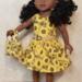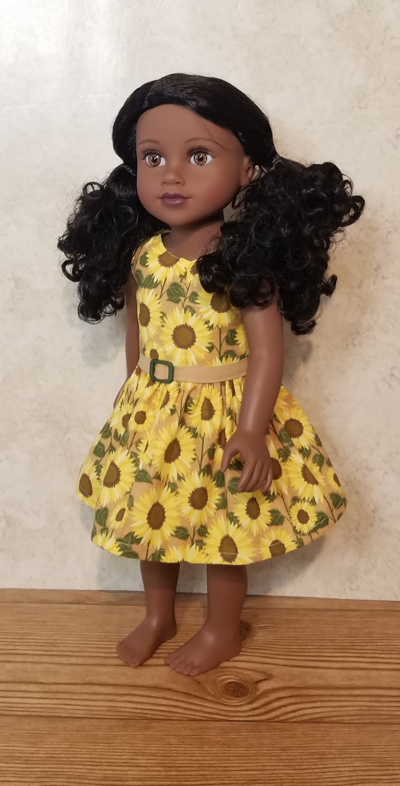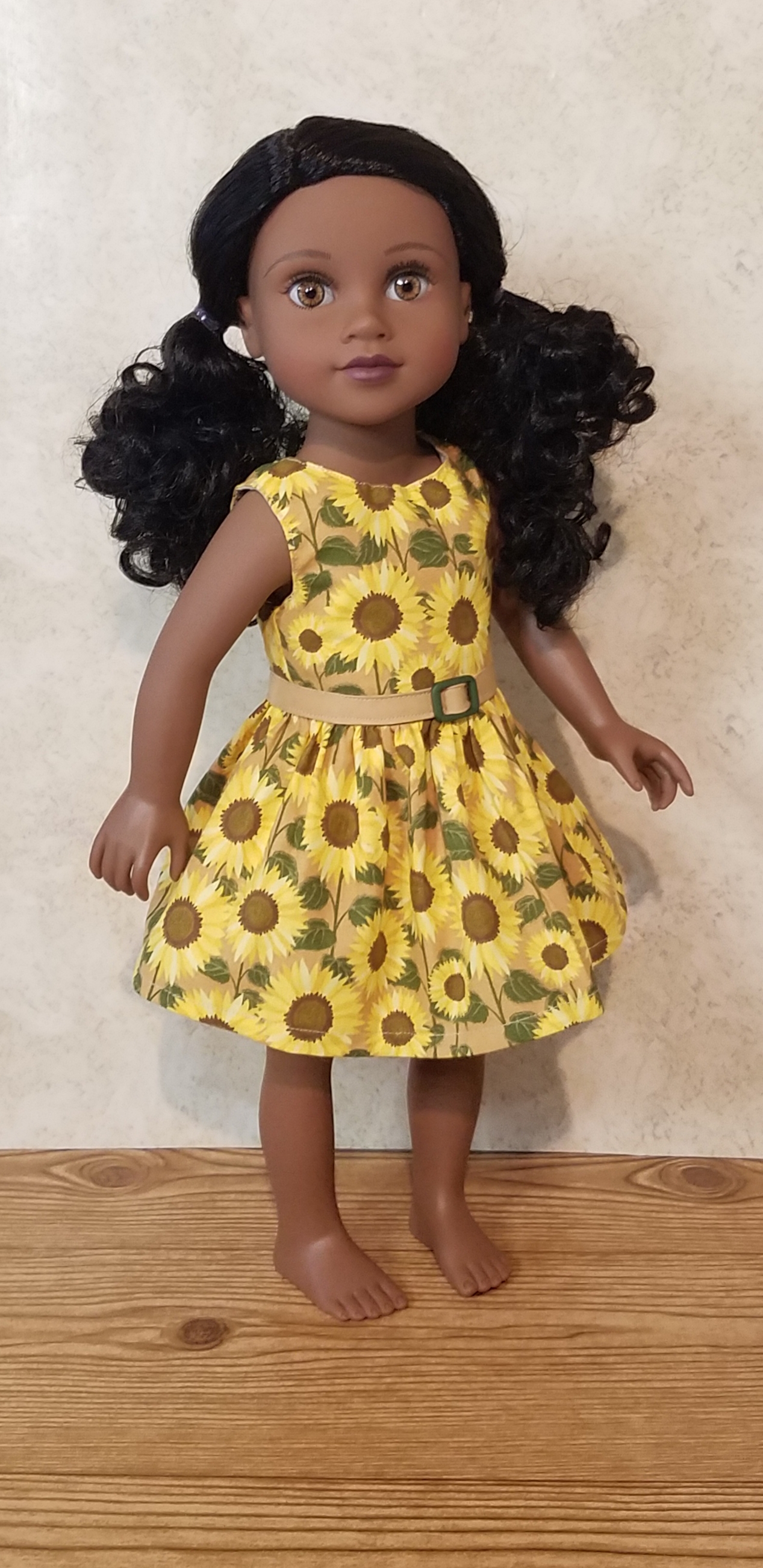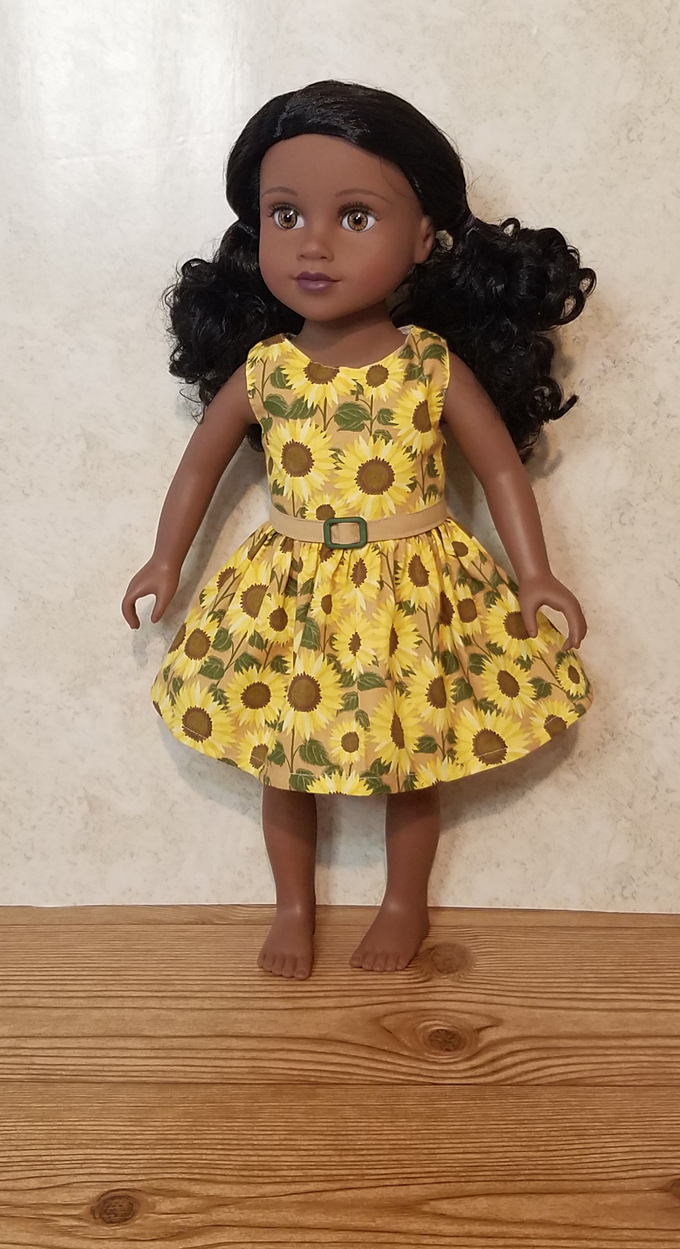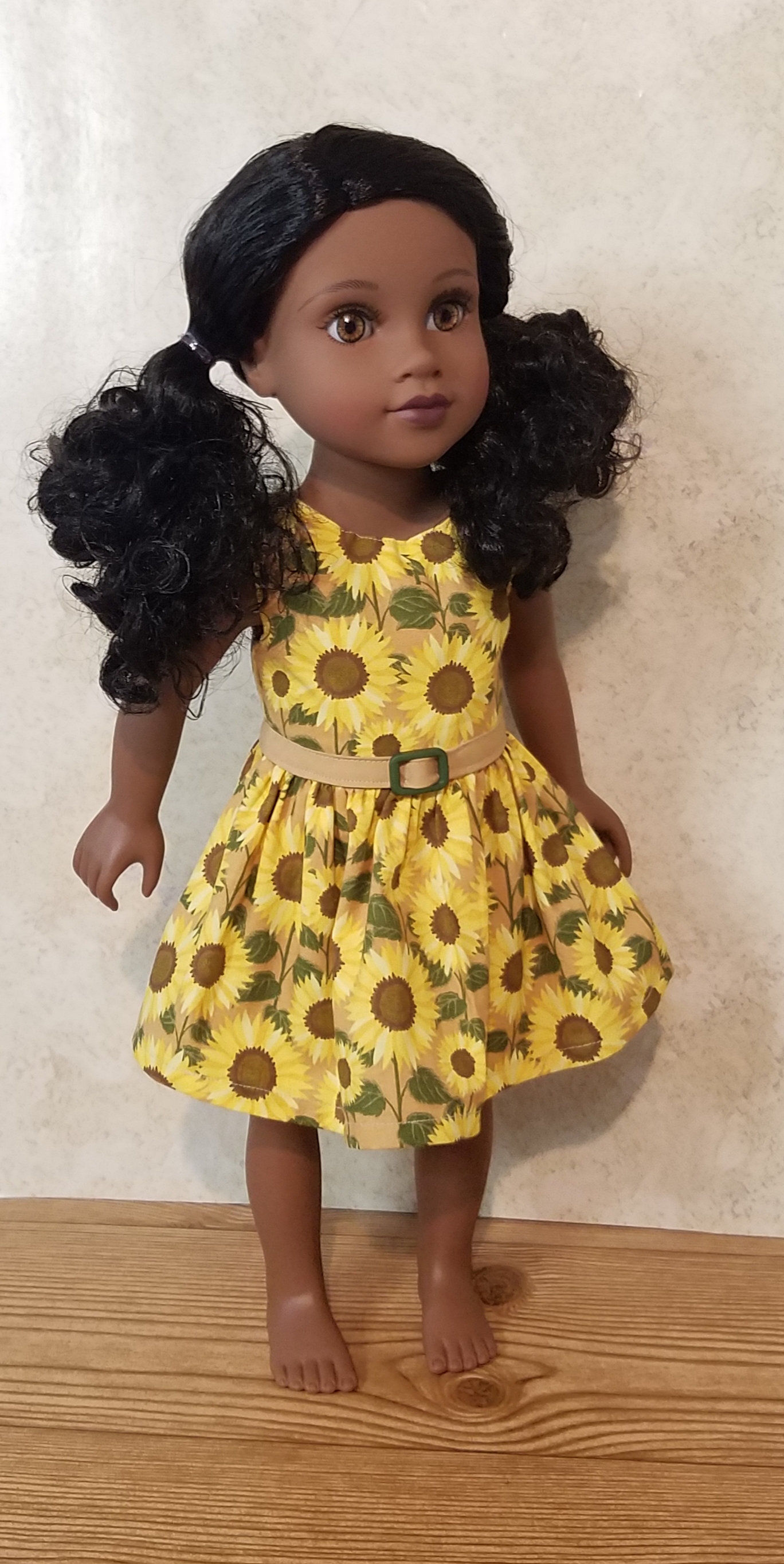 Bring a little autumn sunshine to your doll’s wardrobe with this handcrafted sunflower and beige dress, perfect for Thanksgiving gatherings and fall playtime. Made with premium cotton fabric, it features a simple hook-and-loop closure at the back, making it easy for little hands to dress and undress their dolls. The dress measures 10 inches from shoulder to hem with a 10 3/4–11 inch waist, designed to fit 18-inch dolls including American Girl, Gotz, Our Generation, Journey, and Springfield Collection. A thoughtful choice for Thanksgiving, birthdays, Christmas, Hanukkah, Valentine’s Day, Easter, or just because, this dress is sure to delight children and collectors alike. Each piece is carefully stitched in a smoke- and cat-free environment, shipped quickly, and always handcrafted in the USA. Dolls and shoes shown are for styling only. Thank you for visiting—your support of handmade means so much!
