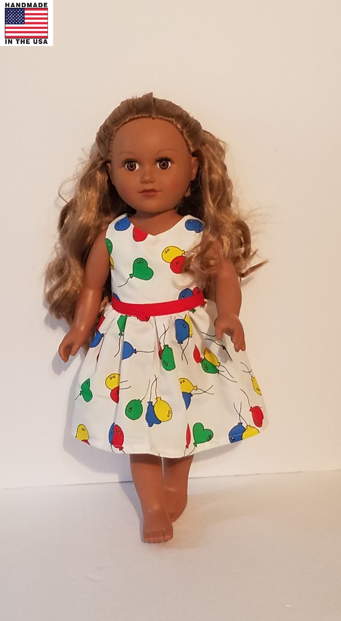 Design: Handmade with love, our doll dress showcases white cotton fabric adorned with festive colorful balloons.
