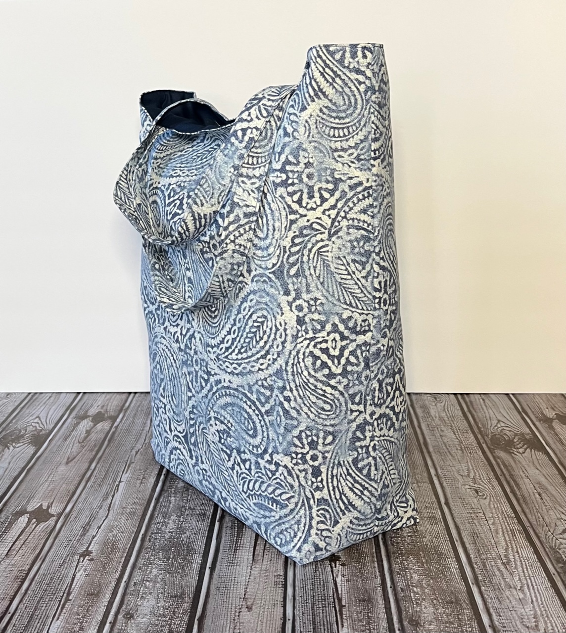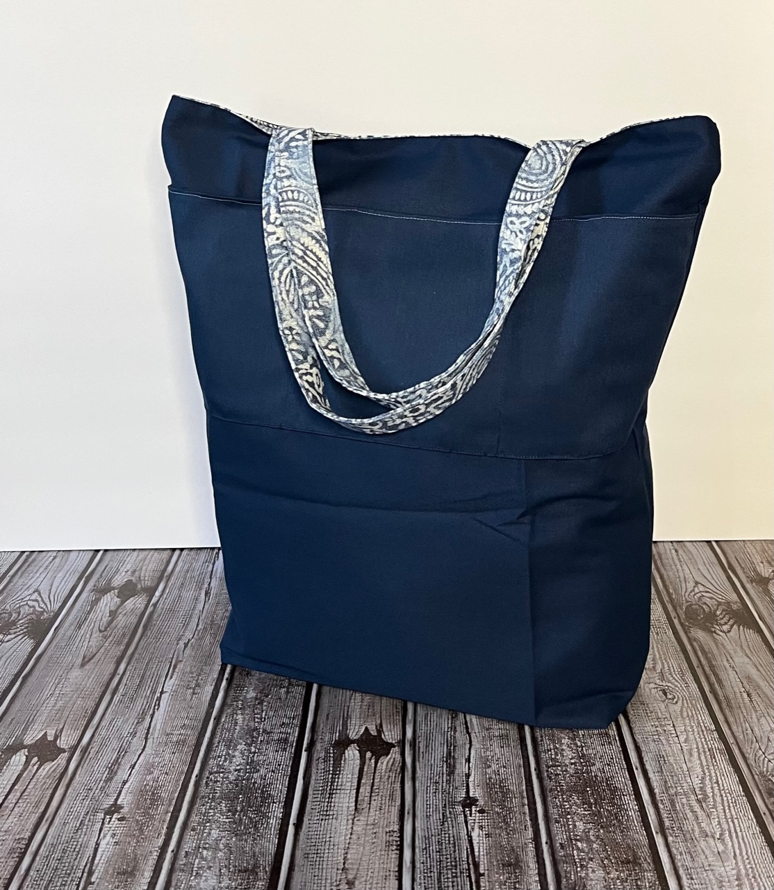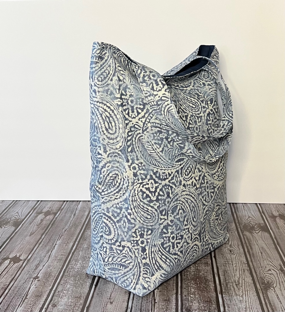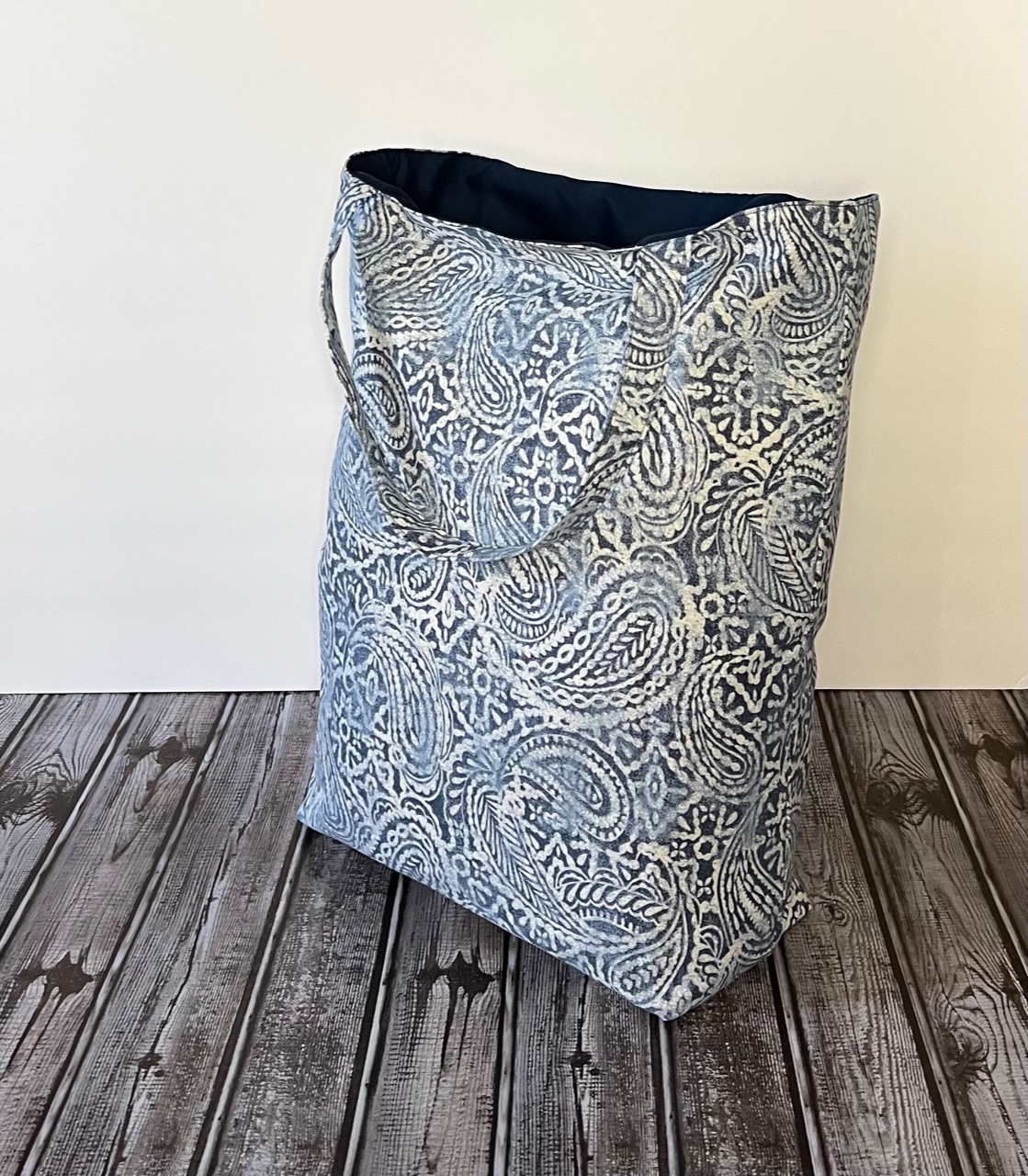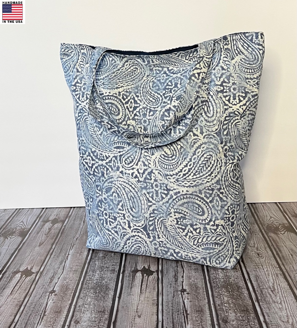 These handmade Tote Bags are Eco friendly! This large sustainable blue paisley floral with navy blue inside with three large pockets grocery shopping bag will carry large and heavy loads for years to come. These are very functional. The reusable shopping bags are made from canvas and cotton. All inside side seams have double sticking for increased durability and strength. All my bags have a medium weight lining. The straps are made from 1" wide matching fabric, and they are approximately 18inches long and are comfortable to hold by hand, but long enough to comfortably wear on your shoulder.