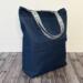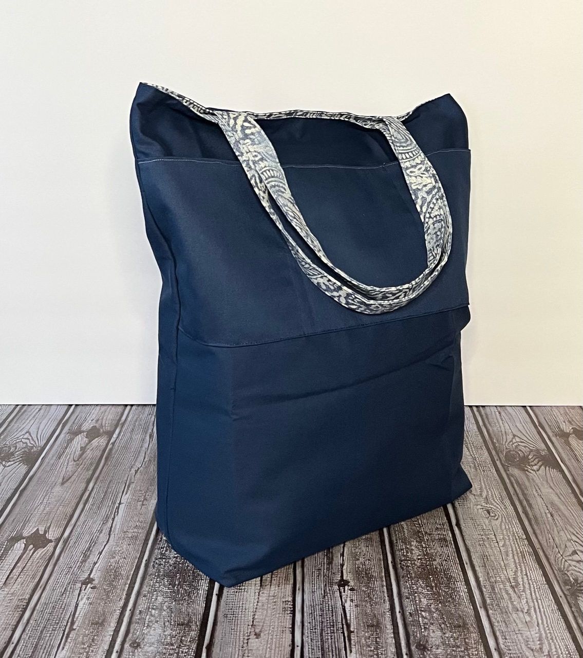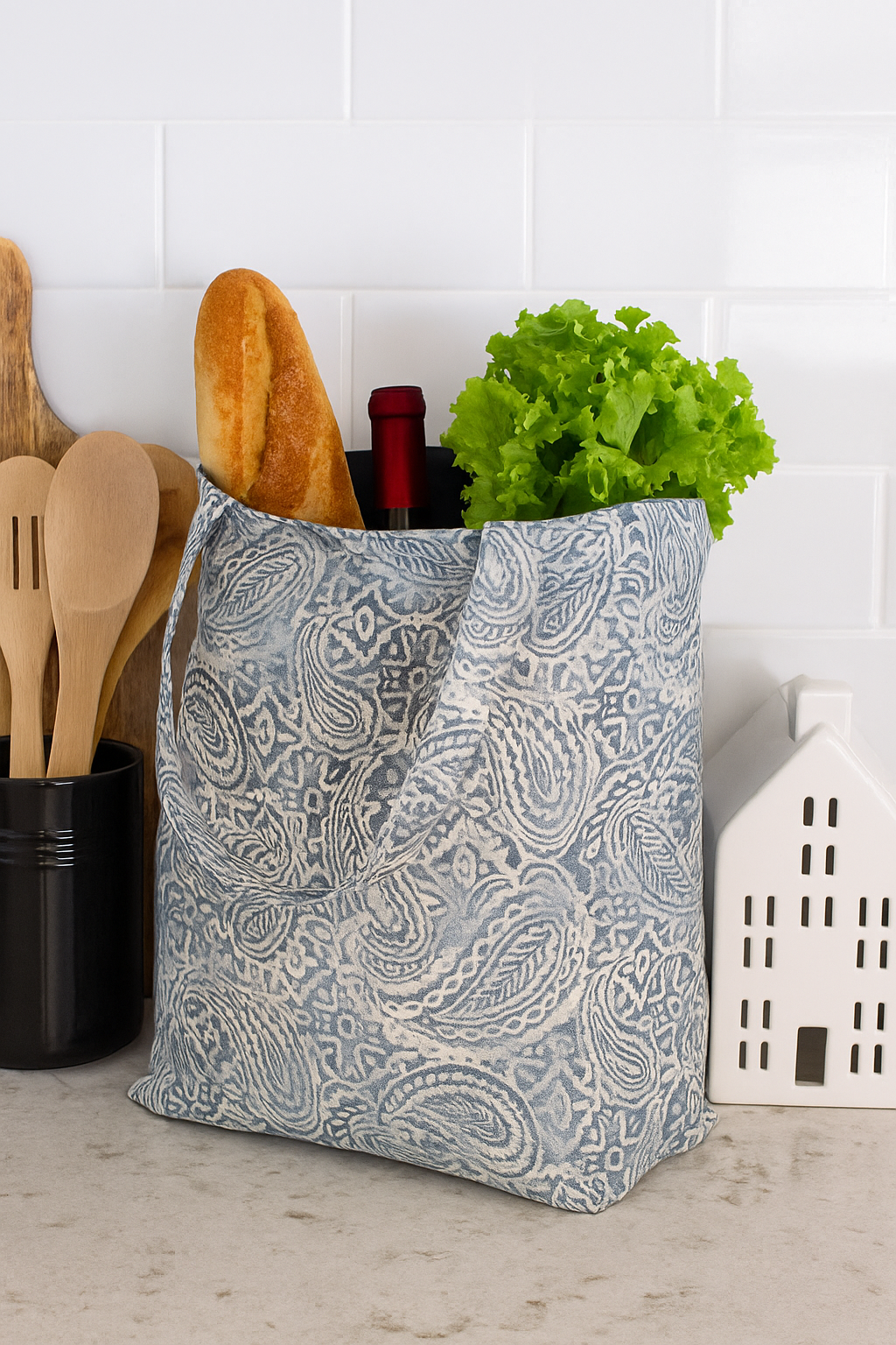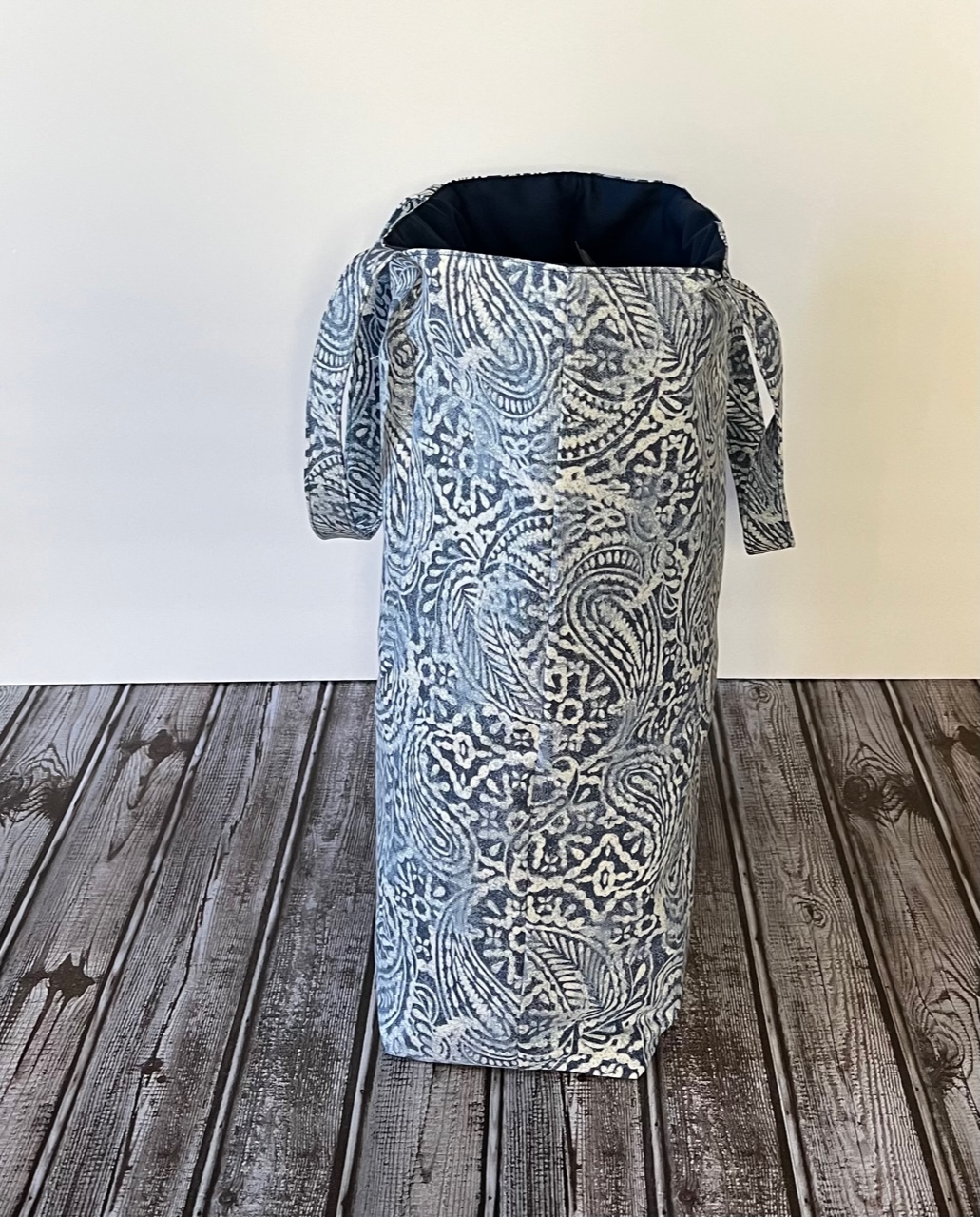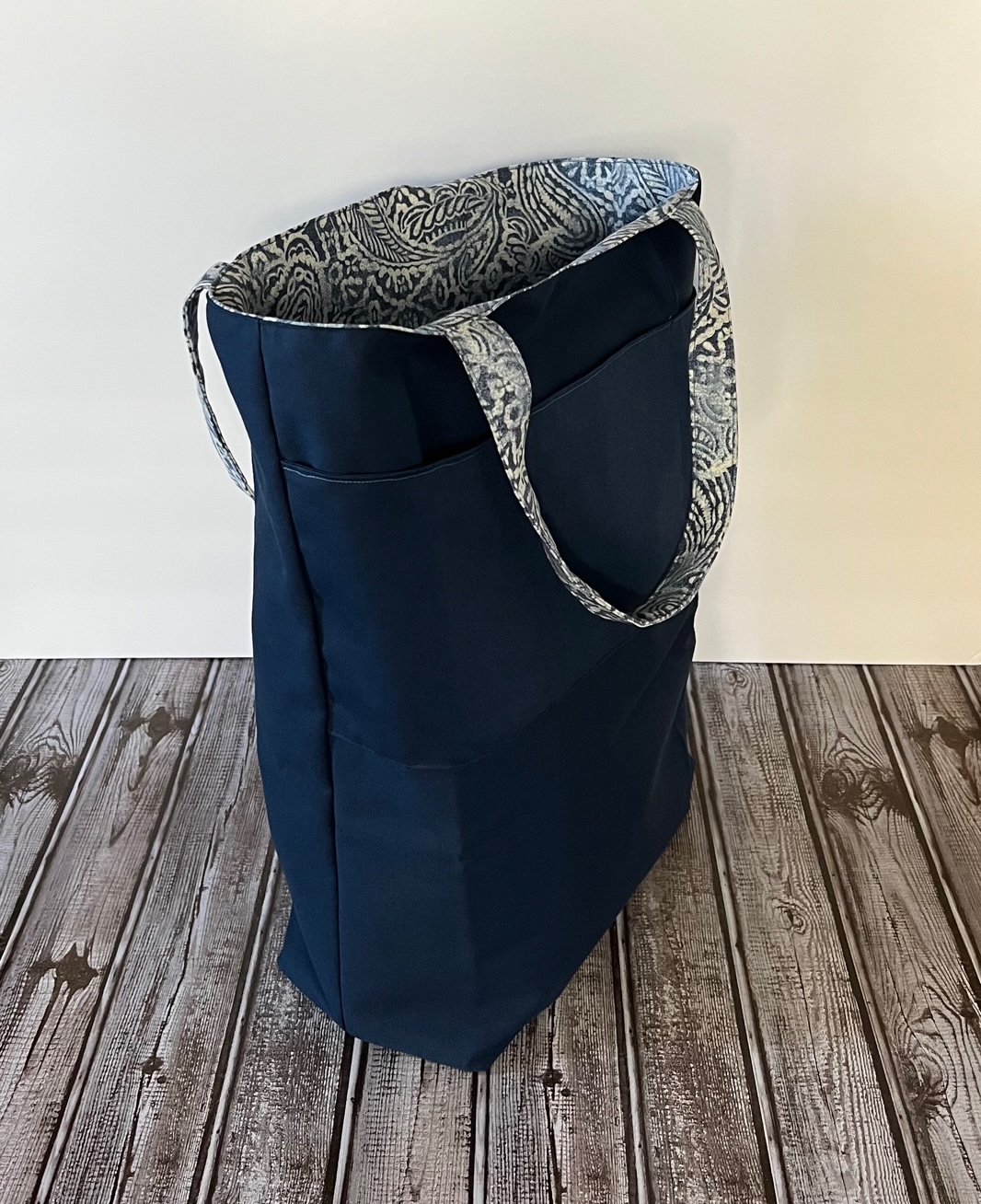 These handmade Tote Bags are Eco friendly! This large sustainable blue paisley floral with navy blue inside with three large pockets grocery shopping bag will carry large and heavy loads for years to come. These are very functional. The reusable shopping bags are made from canvas and cotton. All inside side seams have double sticking for increased durability and strength. All my bags have a medium weight lining. The straps are made from 1" wide matching fabric, and they are approximately 18inches long and are comfortable to hold by hand, but long enough to comfortably wear on your shoulder.