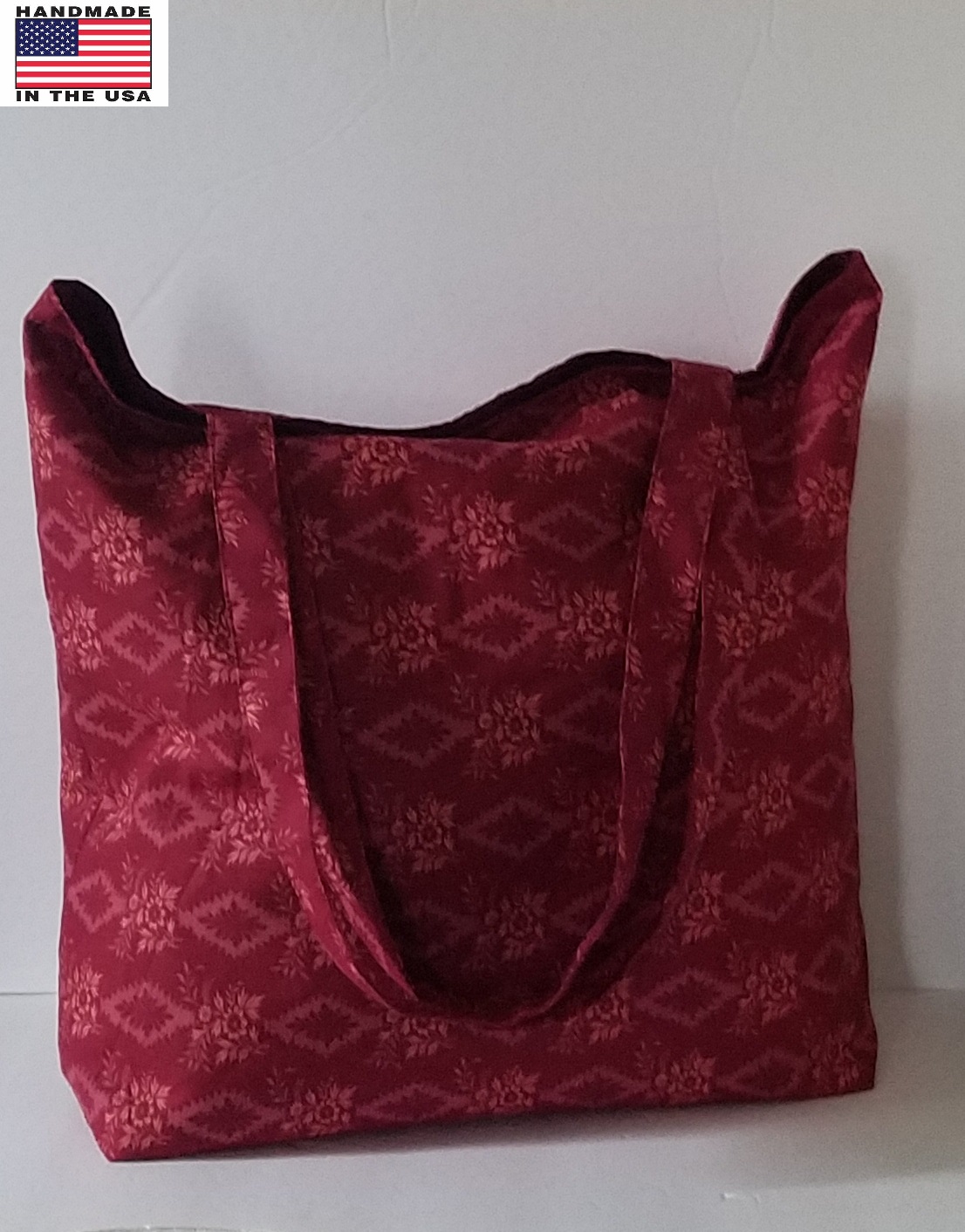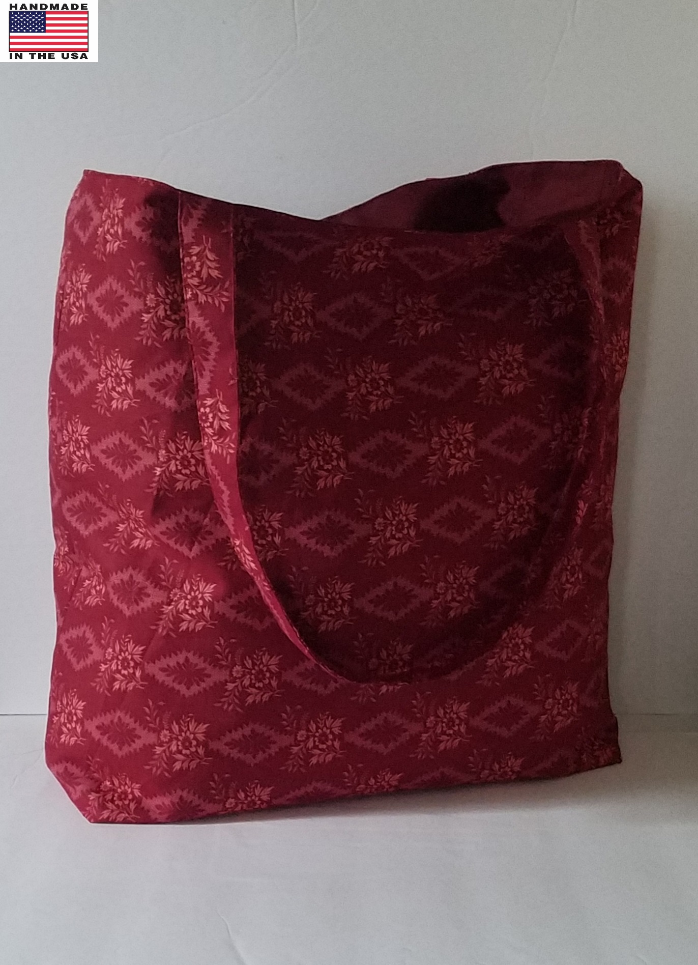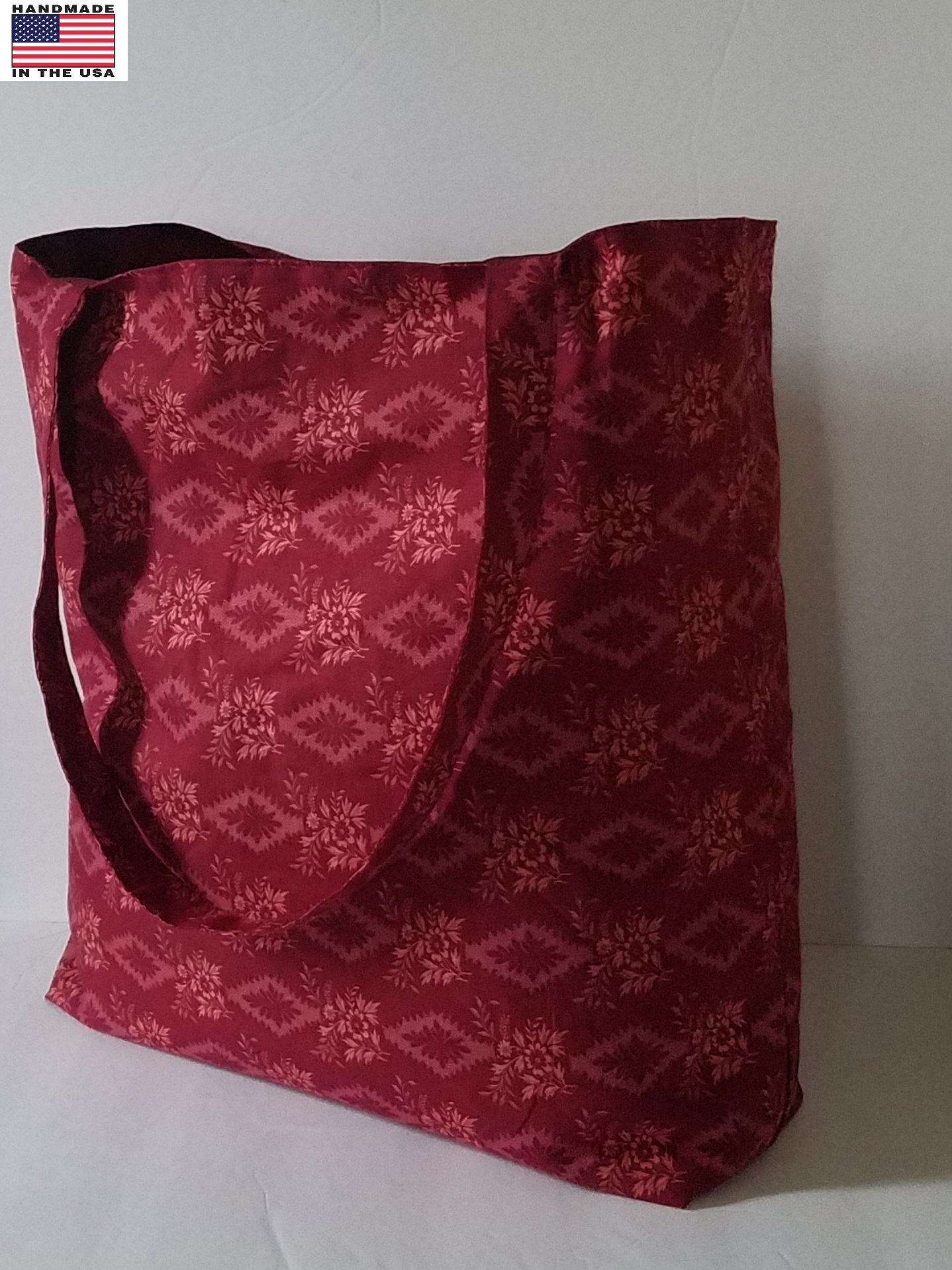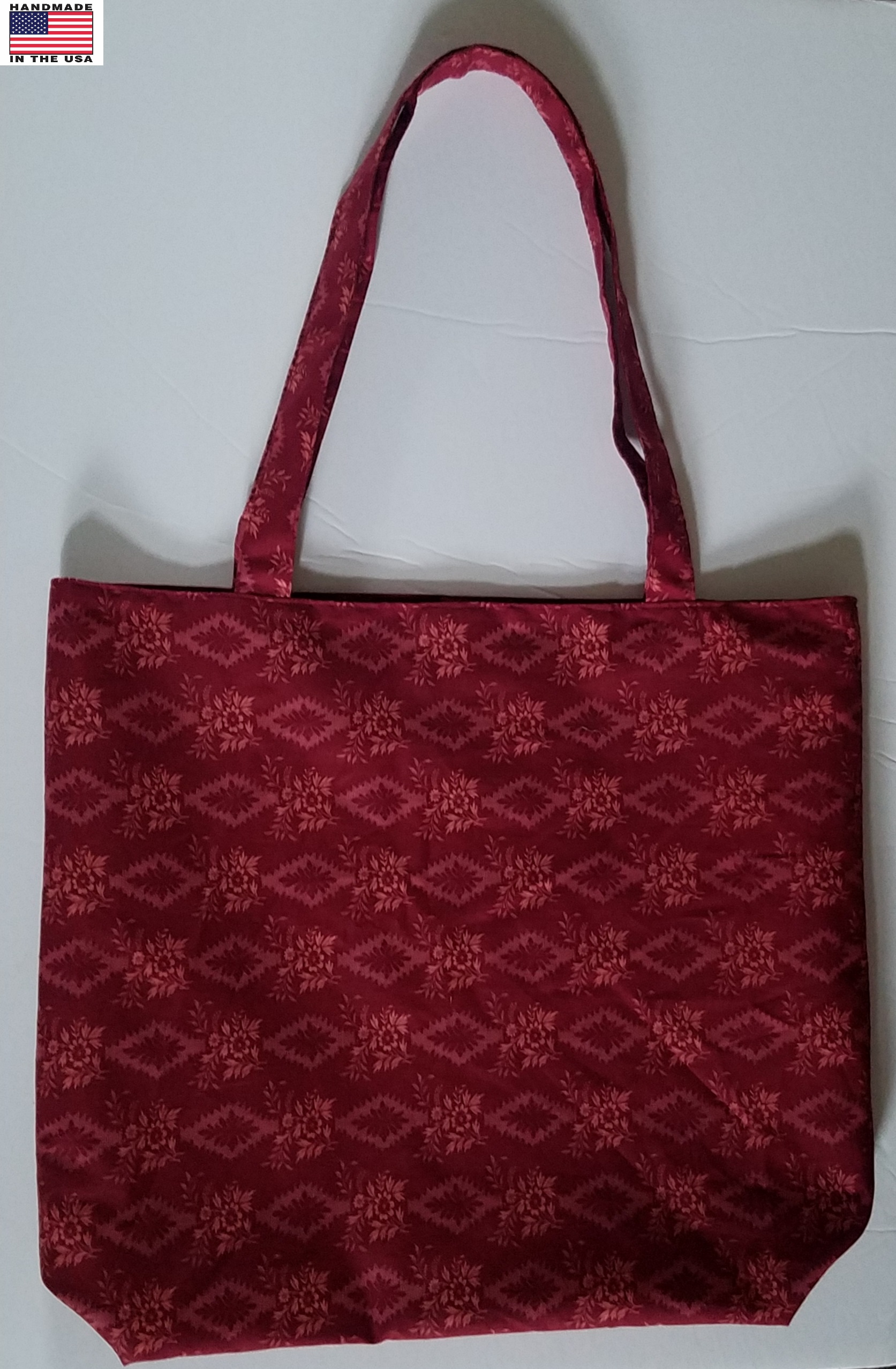 These handmade Tote Bags are Eco friendly! This large sustainable Burgundy Southwestern with burgundy inside grocery shopping bag will carry large and heavy loads for years to come. These are very functional. The reusable shopping bags are made from canvas and cotton. All inside side seams have double sticking for increased durability and strength. All my bags have a medium weight lining. The straps are made from 1" wide matching fabric, and they are approximately 18inches long and are comfortable to hold by hand, but long enough to comfortably wear on your shoulder.