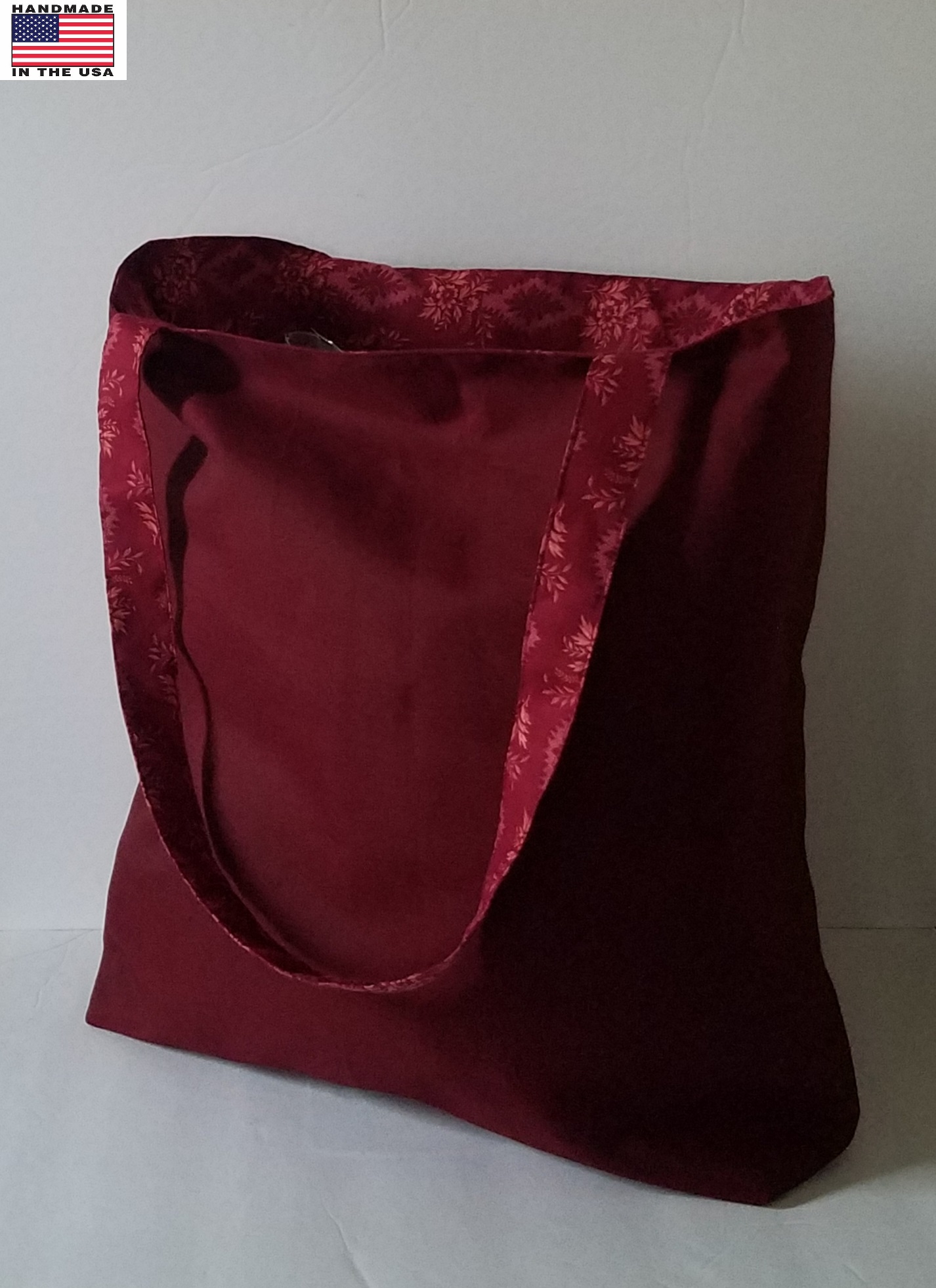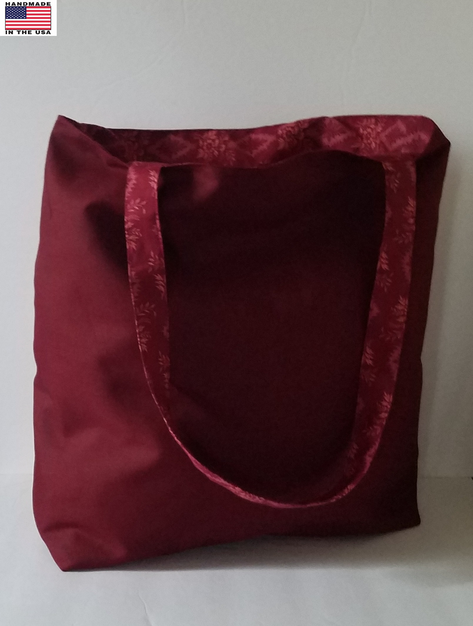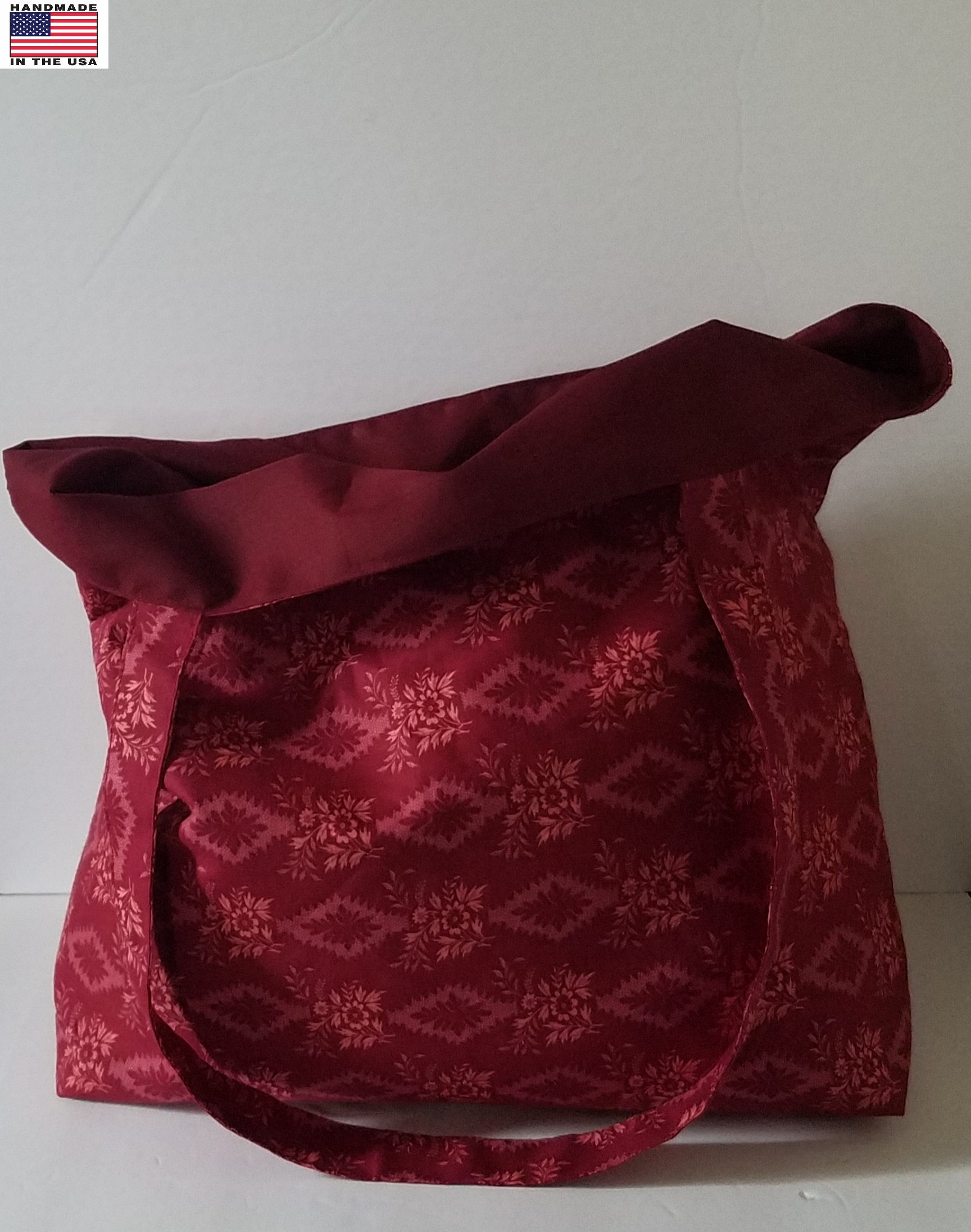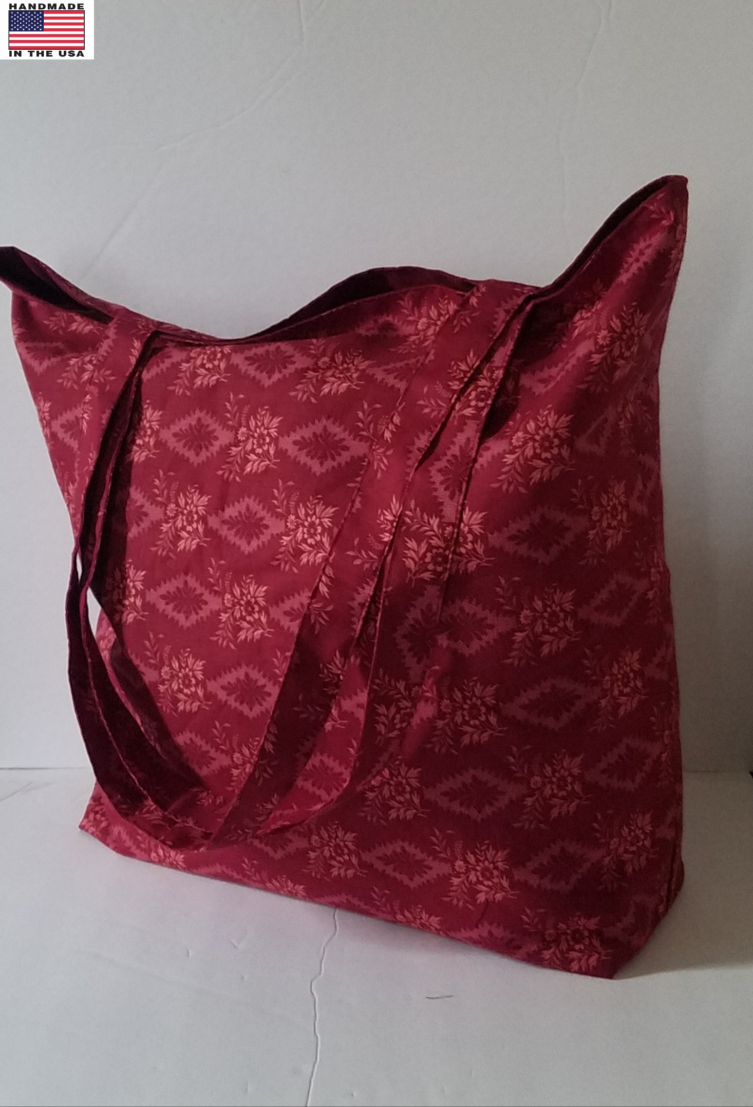 These handmade Tote Bags are Eco friendly! This large sustainable Burgundy Southwestern with burgundy inside grocery shopping bag will carry large and heavy loads for years to come. These are very functional. The reusable shopping bags are made from canvas and cotton. All inside side seams have double sticking for increased durability and strength. All my bags have a medium weight lining. The straps are made from 1" wide matching fabric, and they are approximately 18inches long and are comfortable to hold by hand, but long enough to comfortably wear on your shoulder.