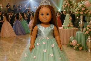 18in Quinceañera Princess Sage and 3D Pink Butterfly Doll Gown